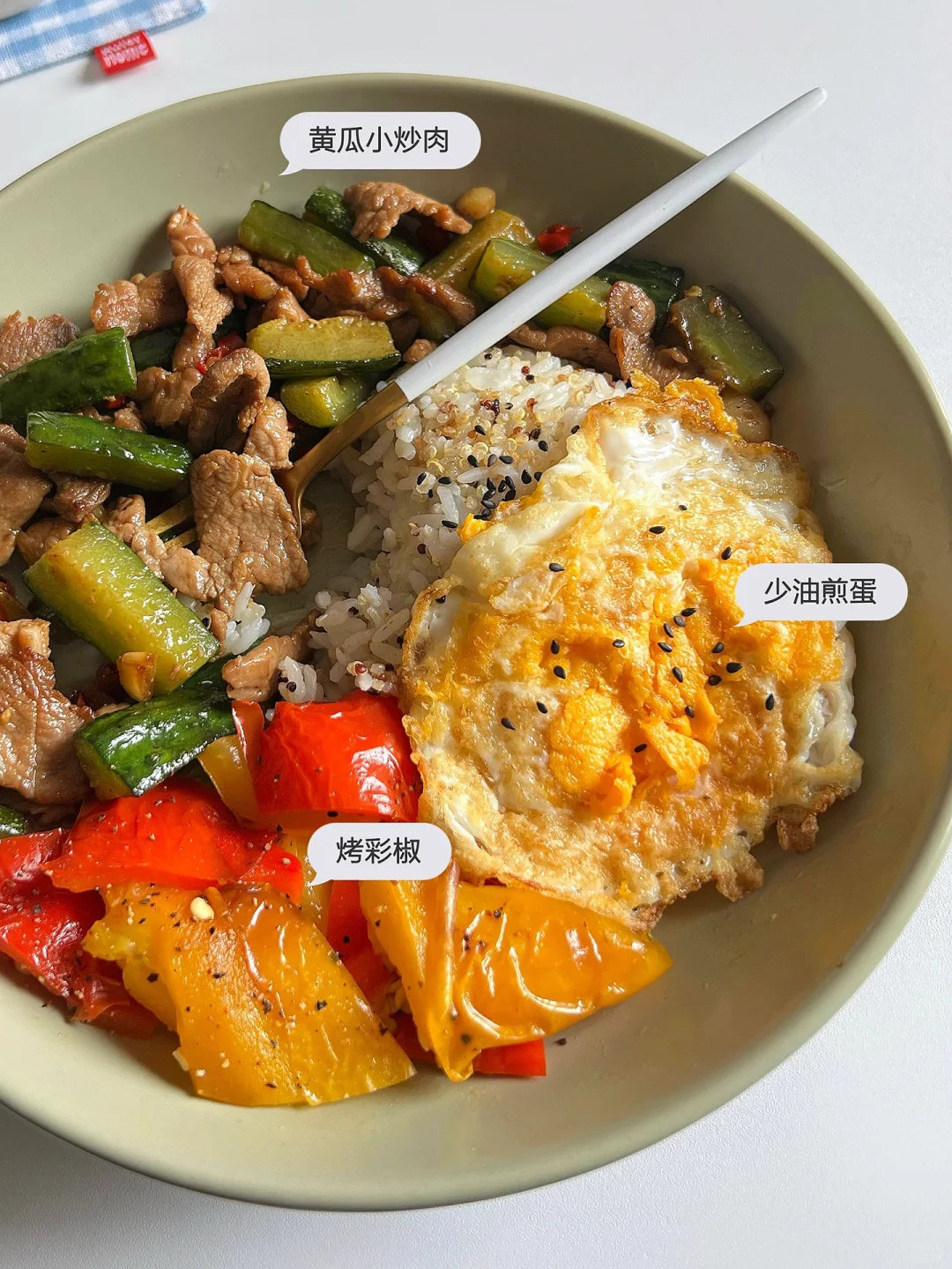 今天吃的是黄瓜小炒肉➕凉拌烤彩椒➕少油煎蛋,好美味哦~~吃起来很安逸!