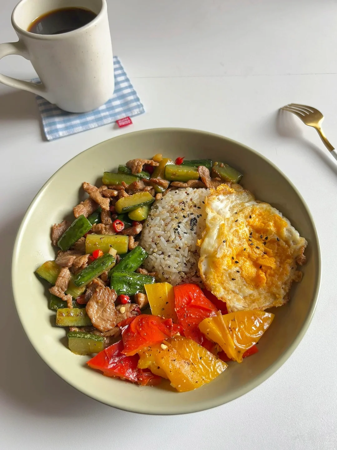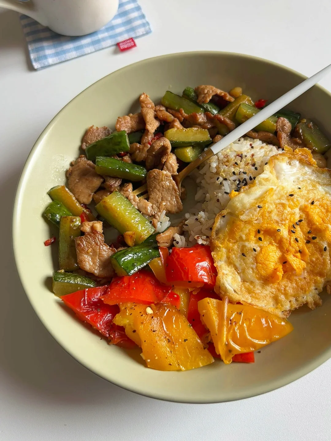 🫑 食材:瘦肉、黄瓜、彩椒、鸡蛋、大蒜/小米辣