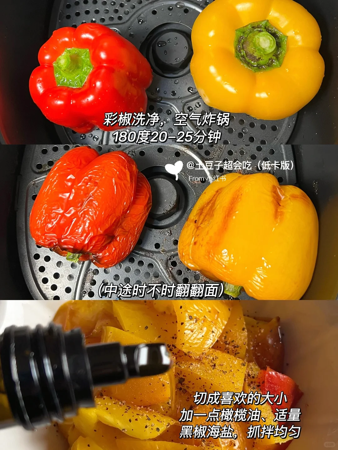 1⃣️ 彩椒洗净,放入空气炸锅,180度20-25min(中途时不时翻翻面);