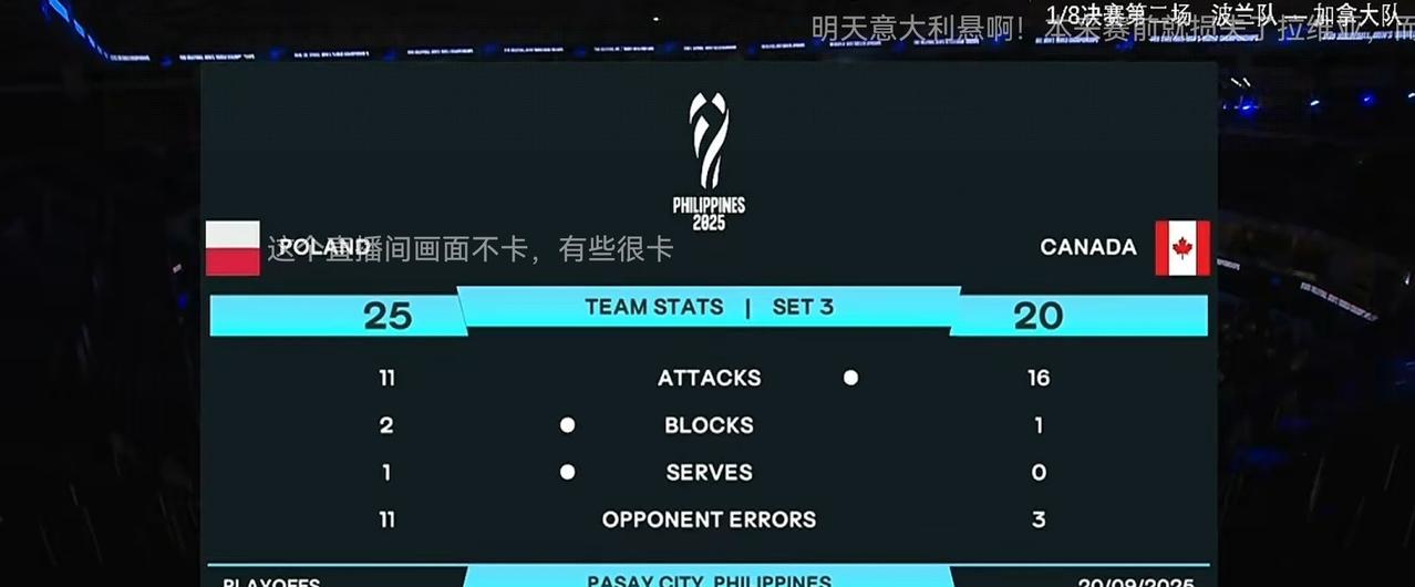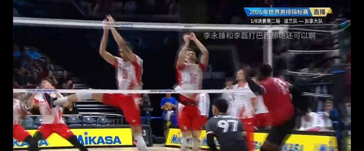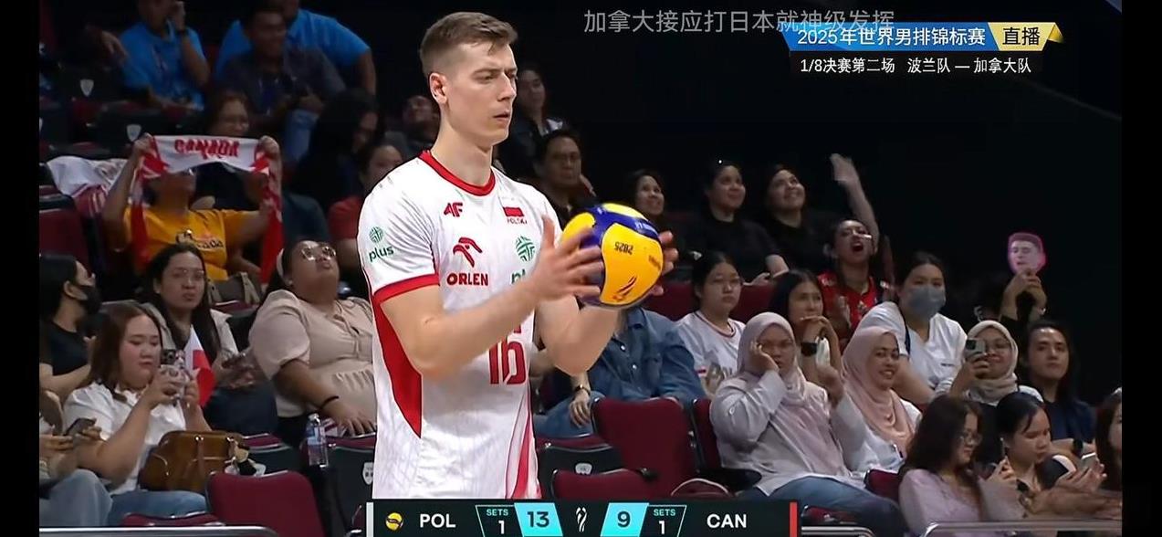 世锦赛1/8决赛第二场,波兰男排第三局25:20胜加拿大男排,大比分波兰男排2:1领先。 第三局加拿大男排失误送分竟然送了11分!帮着波兰男排赢自己半局球[不看] 加拿大男排进攻并不弱,从前三局球来看,谁失误少谁赢。 局末加拿大队依靠13号埃文斯扣球追分,一点攻也挺累人。球迷刚说完13号有点没劲了,结果13号埃文斯发球失误就送给波兰男排第25分[不看] 主播说波兰男排整体实力还是强于加拿大男排。 比赛还得靠自己的实力啊。