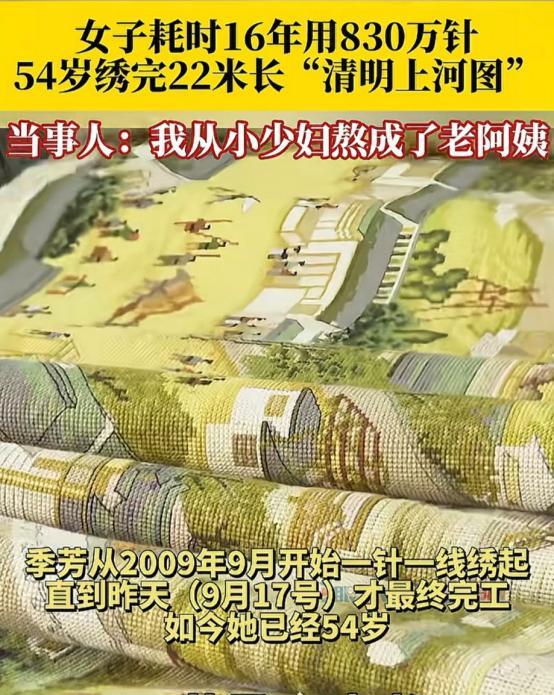 “太不可思议了。”2009年重庆一少妇为了打发空余时间,不去蹦迪也不玩游戏,而是用了16年时间,总共用830万针,绣了一幅22米长的“清明上河图”。现在她已经54岁了,她自己也调侃:自己成功从小少妇熬成了老阿姨。网友:要是四大名绣,价值就高了,花了16年时间总得产生啥价值吧,结果是十字绣。 16年830万针!她把“活着的”清明上河图带到你眼前,看完我跪了! 这世上有没有什么事儿,能让你看得目瞪口呆,然后发自内心地说一句:“我服了!”? 有!今天这个故事的主角,是一位重庆的女士。她用16年的时间,830万根绣针,硬是把那幅咱们教科书里、博物馆里的《清明上河图》,给“活生生地”绣了出来,而且还不是一般的绣,那长度,足足有22米! 您想象一下,22米啊!光是听着,我的鸡皮疙瘩都起来了。 这故事啊,得从头说起。这位女士,她原来不是重庆人,是安徽那边的。日子过得嘛,就像大多数人一样,平平淡淡。 可谁知道,生活这玩意儿,有时候就是这么奇妙,一个不经意的瞬间,就能改变一个人。她呢,就是偶然间看到了别人绣的十字绣。 可能是一幅小小的花,也可能是一句吉祥语,但就是那一眼,在她心里种下了一颗种子。这颗种子,可不是随便长长就完了,它在她心里生根发芽,长成了参天大树,最后让她决定,要挑战一个简直可以说是“不可能完成的任务”——绣一幅22米长的《清明上河图》! 咱们都知道,《清明上河图》是啥?那是北宋时候,一个叫张择端的画家,给咱画的。画里头,那叫一个热闹!一个朝代的繁华,老百姓的日子,从达官贵人到街头小贩,都画得清清楚楚。 这幅画,就像一张老照片,把几百年前的那个城市,给咱定格了。现在,有人要用绣针,把这么一幅画给“活过来”,这得需要多大的耐心和多强的毅力?我估计,换成我,可能绣个手帕都得烦死。 您想想,每天下班,谁不想瘫在沙发上刷刷手机,看看剧,享受一下?可这位女士,她没这么干。她把下班后的时间,还有整个周末,都给了这幅画。 灯光下,她的手里是五颜六色的丝线,眼前是画布。这16年,她牺牲了多少个可以出去玩、可以和朋友聚会的日子?有多少个夜晚,她可能都是在和困意和疲惫做斗争。这已经不是简单的“爱好”了,这是一种近乎“执念”的坚持。 更牛的是什么?是细节!您看这幅绣出来的《清明上河图》,里头有814个人物!814个啊!您能想象吗?每个人物,都得有自己的神态,自己的表情,不能是千篇一律的。 还有那些船,那些屋子,那些桥,甚至人物头上的发丝,船身上的纹理,栏杆的间隔,都得一丝不苟。这得要求绣的人,眼睛得像鹰一样锐利,手得像婴儿一样稳当。稍有差池,一针下去,可能就毁了整幅画的意境。 所以啊,她得经历多少次“拆了重绣”?那得是多么大的耐心,才能在一次次失败中爬起来,继续往前走。这就像是在跟时间赛跑,又像是在跟自己的完美主义较劲。 这个故事传出去,那可不得了,网友们那反应,那叫一个精彩!很多人上来就是一句“太牛了!”,说自己别说16年绣画,估计16年连一部连续剧都追不完。 那种敬佩,那是真的发自内心的。也有人感叹,这简直是“神仙般的耐心”,自己在这方面真是“自愧不如”。 当然了,也有一些网友,在惊叹之余,会开始“反思”。有人会问:“这样拼命,会不会耽误了正事?比如家庭、孩子,还有自己的事业发展?” 这话说得也实在,16年,这可是人生中非常宝贵的时光。有人担心,这种极端的投入,会不会让生活失去平衡。 但更多的人,还是从这个故事里找到了“力量”和“启发”。有个网友说:“我最近工作上遇到瓶颈,老想放弃,看到这个故事,我突然觉得,再难的事,只要一直做下去,总会有个结果。”还有人受到鼓励,说:“这让我想起我年轻时的一些梦想,是不是也可以重新捡起来,一点点去实现?” 其实啊,这位女士最后激动落泪,她说的是“坚守带来的成就感”。这话可太有分量了。胜利,可能是打败了对手,或者完成了某个指标。但成就感,那是一种发自内心的满足,是自我价值的实现。 当一针一线都变成了一幅生动的画卷,当过去16年的汗水终于凝聚成眼前这22米的繁华,那种感觉,是任何金钱和赞美都无法替代的。 那么,咱们该怎么看待这种“坚持”呢?我觉得,咱们得为这位女士的这份毅力点赞,她的故事确实能激励很多人。 但是,也别盲目地去复制。每个人都有自己的生活方式,有自己的追求。不是每个人都得去绣一幅22米的画。 这种“坚持”,不一定非得是惊天动地的壮举,它也可以体现在每天坚持锻炼身体,每天坚持学习新知识,每天认真做好自己的工作,每天用心陪伴家人。这些看似平淡无奇的点点滴滴,日积月累,也能汇聚成强大的力量。