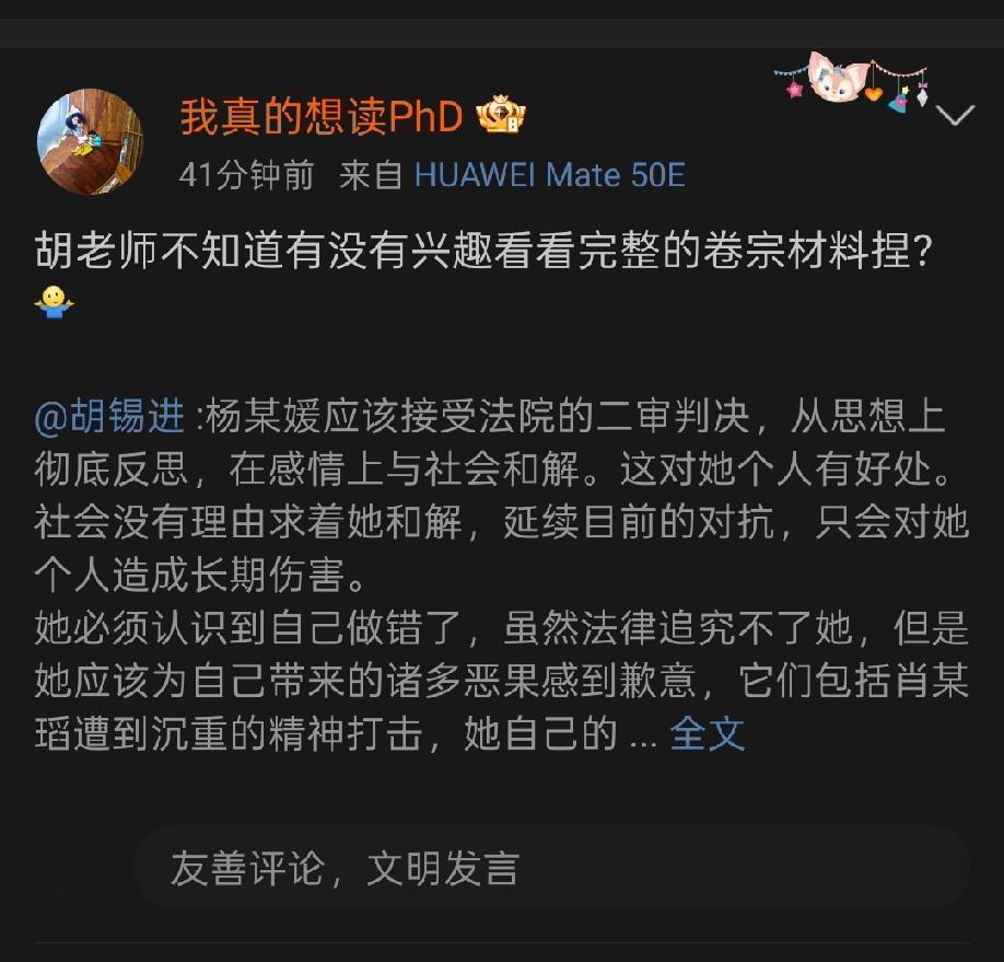 杨同学真是无药可救,不知悔改啊,二审判决结果出来了,原以为她会道歉会愧疚会反思,没想到依然还是如此的嚣张跋扈,面对评论家胡锡进的良言相劝,还反驳说想让其看看完整的卷宗材料,难不成她还以为大家在冤枉她吗?她还发文,一切向前看,看来网络舆论对她丝毫没有影响,我不知道她哪来的勇气,能活成这样的公众人物,正常的一个人,总是为自己做错的事,伤过的人心生忏悔之情,可她呢,似乎从来不会意识到自己有错,真是一个悲伤的故事!