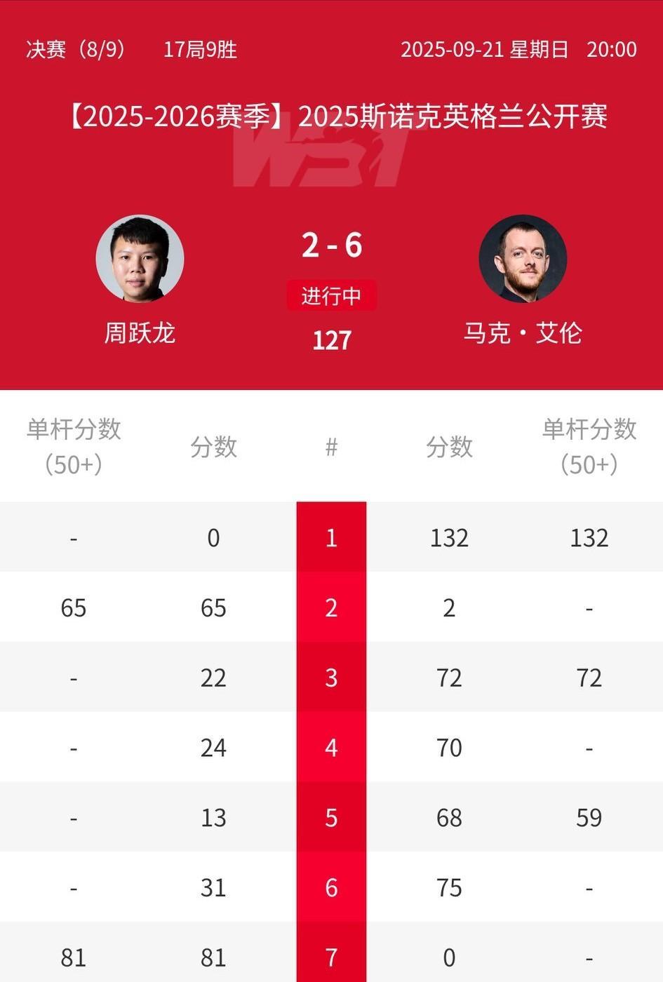 技不如人,想夺冠太难了!2025斯诺克英格兰公开赛决赛,上半场周跃龙2-6落后艾伦,艾伦仅差3局夺冠。 冠军:10万英镑;亚军:4.5万英镑。 周跃龙今天的表现差强人意,状态没有调整过来。前四局1-3落后艾伦。 中场休息回来,龙哥的状态还是不如意,上半场结束以2-6落后艾伦。 冠军几乎不可能了,连续三场大逆转让艾伦的自信心爆棚,龙哥太难了,首冠依然遥遥无期。