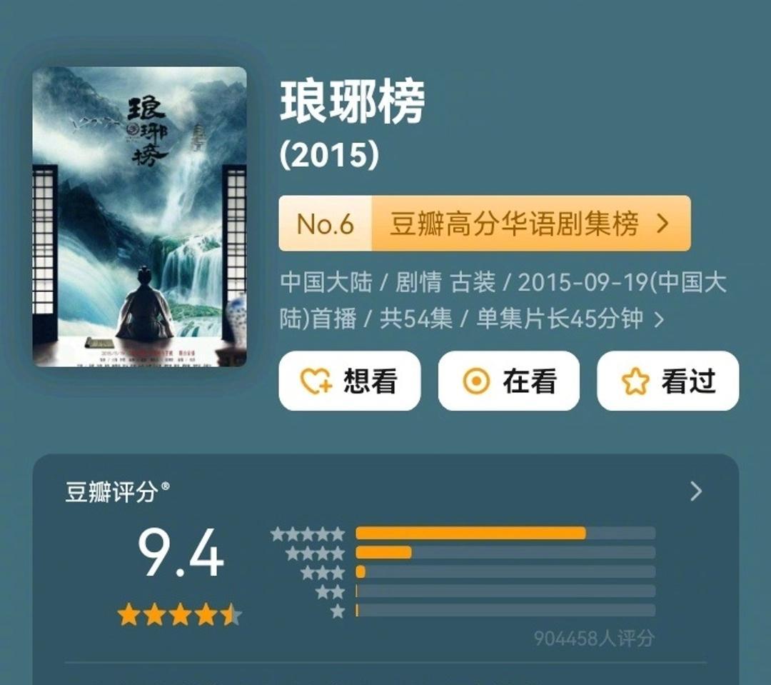 9.4分稳居豆瓣国产剧前十,超90万人评分,每年还在涨~这才是经得起时间检验的真爆剧 你当年追剧了吗?#琅琊榜##琅琊榜# #琅琊片段# #琅琊全集# #琅琊古风# #琅琊君子#