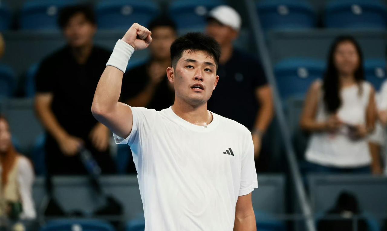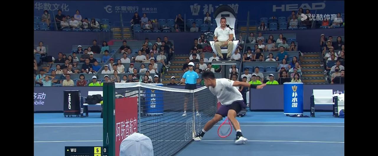第一盘吴易昺没能拿到破发机会,第十一局吴易昺为救网前球从后场飞奔至前场,虽成功救球,但因刹车不及脚触网带(图四)被判丢分,最终被梅总破发。 第二盘吴易昺第一个发球局即遭破发,梅总在发球胜赛局双误被吴易昺回破后5-5平,双方各自保发后进入抢七,吴易昺4:0领先,在梅总连得5分反超后,吴易昺连得3分惊险扳回一盘(这是吴易昺职业生涯和梅总三次交手拿到的第一盘)。 决胜盘第七局吴易昺完成关键破发,之后在发球胜赛局第二个赛点发球直得。
