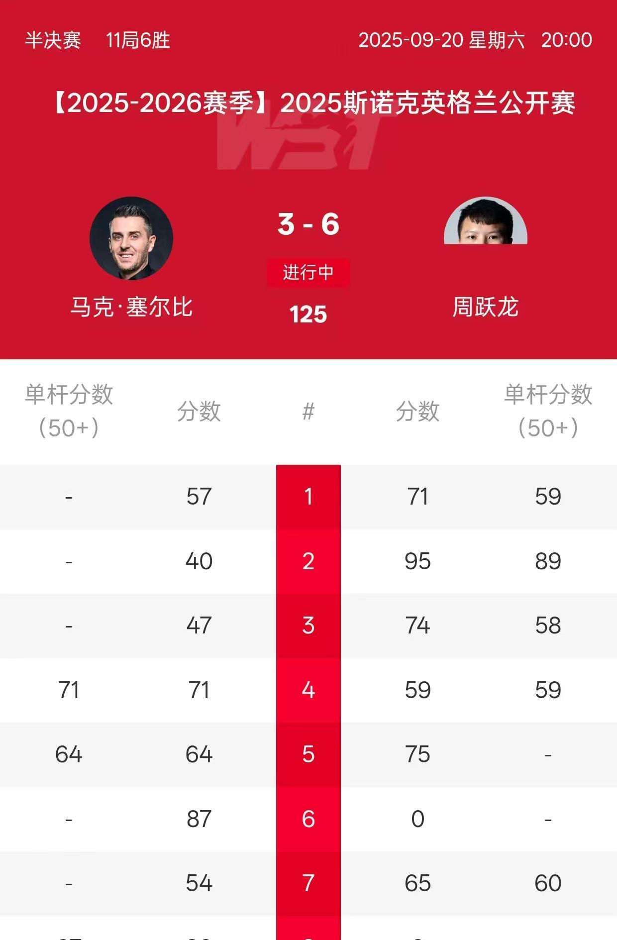 周跃龙6:3塞尔比,闯进英格兰公开赛决赛。经历了这样一场鏖战,对他的成长肯定有很大的帮助,尤其是对面还是赛大师。周跃龙赢下的每一局球,都差不多有单杆50+的表现,但是没有任何一局是一杆制胜的。这样的比赛很煎熬,却很有意义,一个职业球员很难有机会与赛大师进行这样的对抗。 赛大师上了年纪,很明显精力不济了,每杆球都是40分左右就断了。然后周跃龙打出50+,紧接着就转防守。周跃龙总得分521,塞尔比得分524,总分塞大师还多得了三分,最后还3:6输掉了比赛。