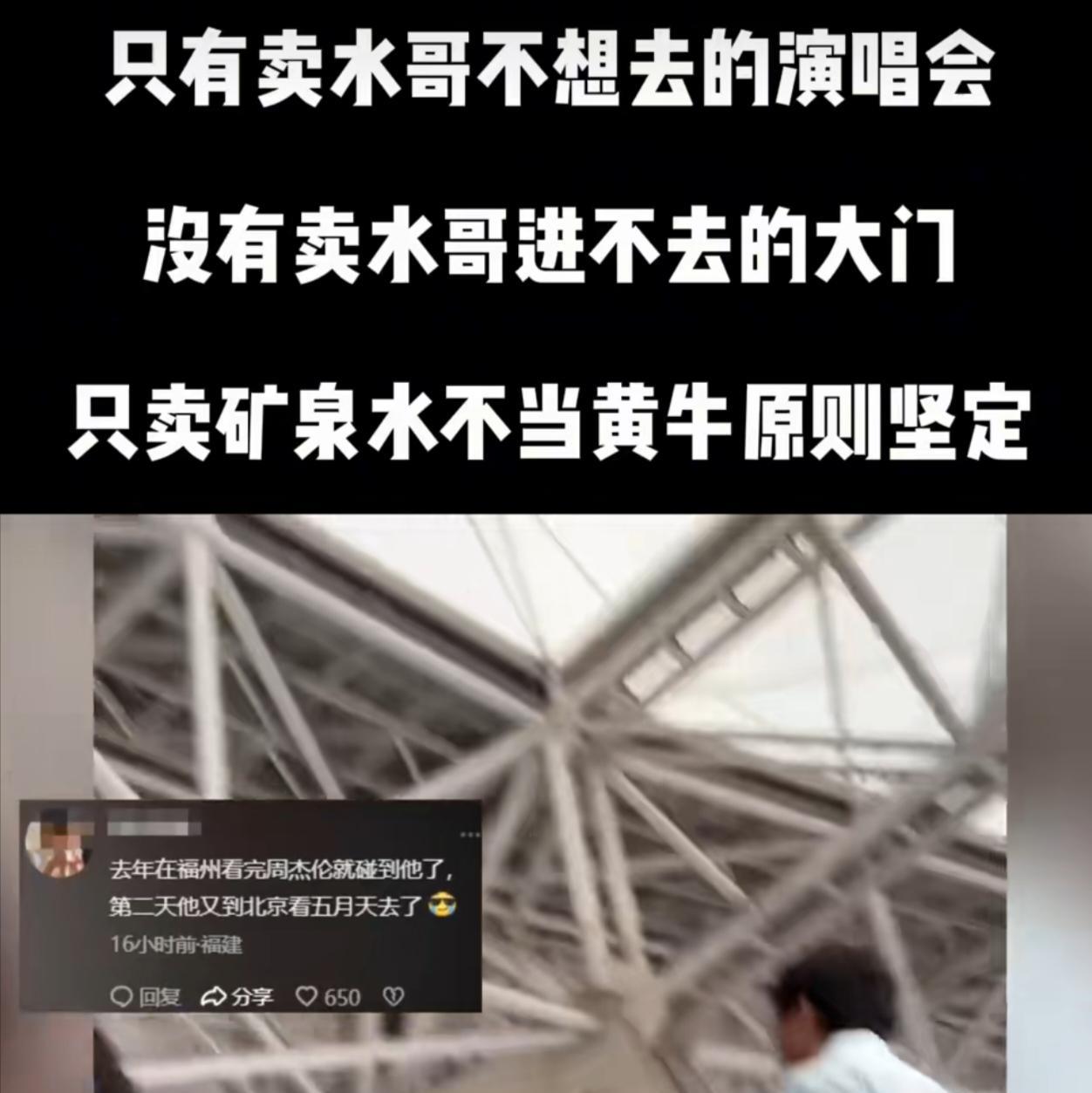 卖水哥:不做黄牛,只做水牛! 我进来的路我进来行,我领别人进来我刑[马思纯的微笑] #大爷卖水卖到周杰伦演唱会现场# 这就是底层人民的生活,没时间追星全是对钱的渴望 这个演唱会或者音乐节如果没有卖水哥,肯定不上档次 他甚至卖完了就出去了,都不看一眼杰伦[泪奔]