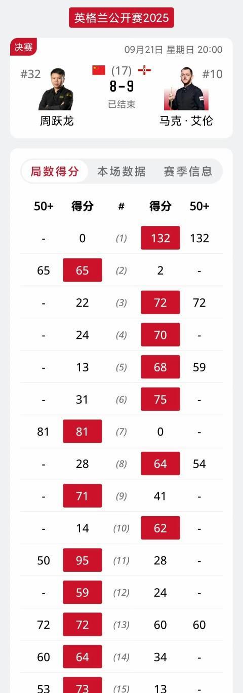 首冠遥遥无期?从被零封到决胜局,周跃龙四次决赛不断进步!周跃龙职业生涯四次排名赛决赛盘点: 2020欧洲大师赛:0-9 罗伯逊 2020单局限时赛:0-1 霍尔特 2022北爱尔兰公开赛:4-9艾伦(4-1后被艾伦打了一个八连鞭) 2025英格兰公开赛:8-9 艾伦