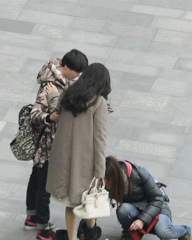 2014年1月28日,在上海《小时代3》片场,杨幂挺孕肚脚踩高跟鞋,助理跪地帮她换上平底鞋稍作休息。