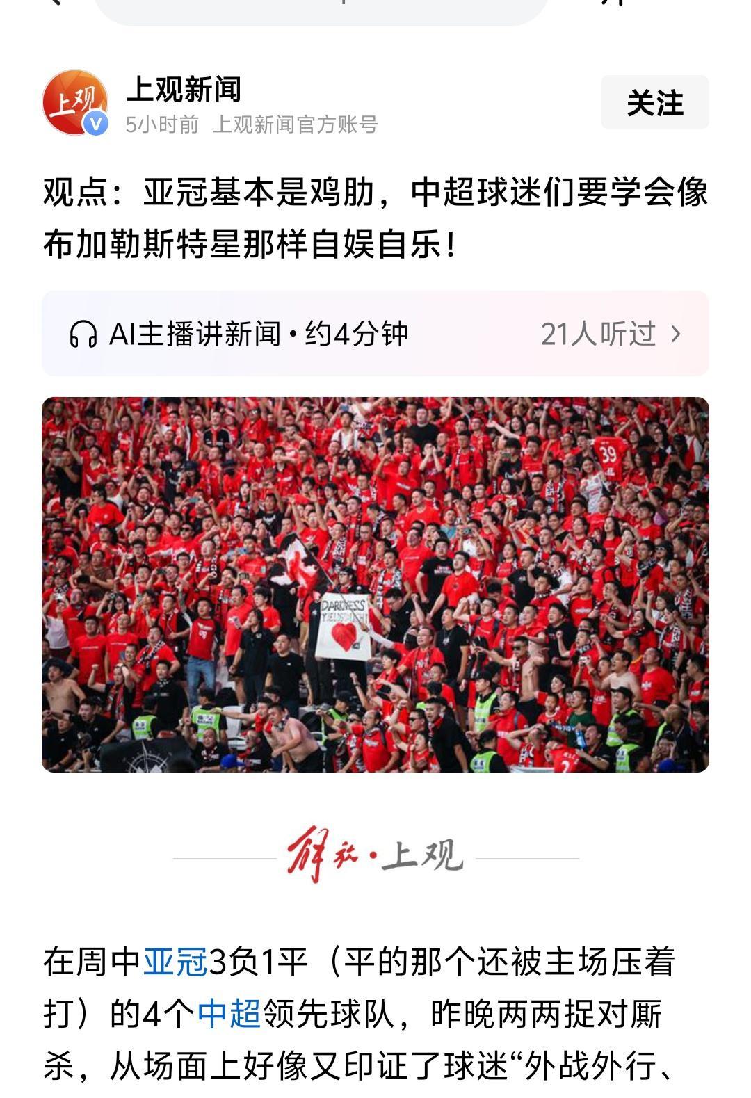 上观新闻表示亚冠是“鸡肋”,中超球迷要学习布加勒斯特星球迷那样自娱自乐!