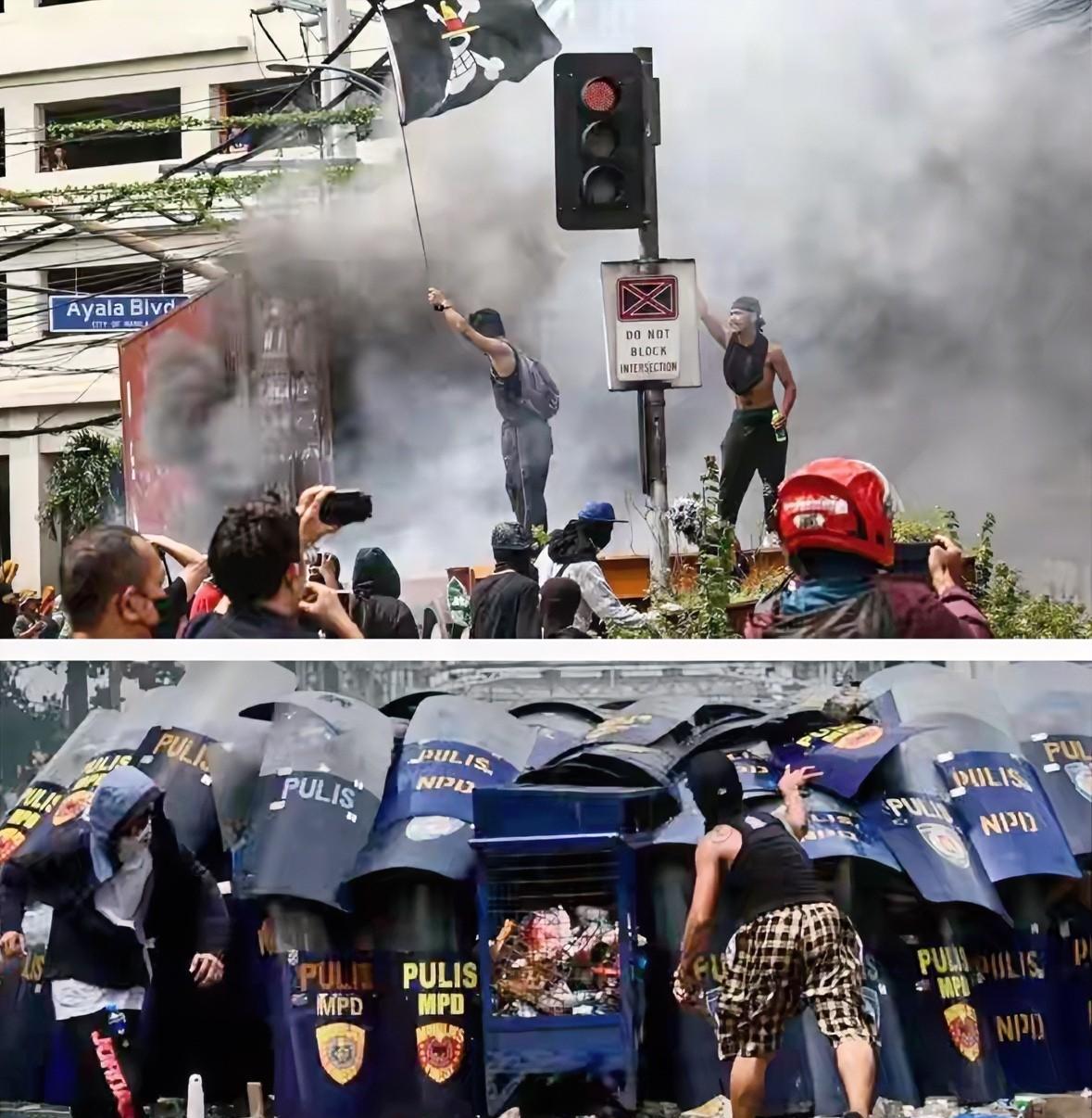 特讯!菲律宾爆发大规模骚乱:总统府前火海滔天,马科斯下落不明 当地时间9月21日,菲律宾多地爆发大规模抗议,超20座城市陷入混乱,这也是马科斯执政以来规模最大的一次抗议活动。 当日,马尼拉近5万民众聚集在黎刹公园,奎松市超1.5万人于人民力量纪念碑集会,全国超6万人参与“万亿比索游行”,强烈抗议马科斯政府虚假防洪工程造成近180亿美元(约1万亿比索)资金损失。 值得注意的是,9月21日正是老马科斯1972年发布戒严令的周年纪念日,如今的腐败丑闻再度勾起民众对过往独裁统治、贪腐横行的痛苦回忆。 在马尼拉总统府(马拉卡南宫)前,抗议活动迅速升级为骚乱。 阿拉亚桥被抗议者封堵,他们手持器械, 投掷石块、瓶子等物品,并焚烧拖车,现场顿时火光冲天。警方紧急举盾防御, 设置燃烧轮胎作为路障。 冲突导致约70名执法人员受伤,1辆警用摩托车被烧毁。 抗议者高喊“让我们进去”,试图冲击总统府,而马科斯全程下落不明,未作任何表态。 双方对峙持续至当晚,警方发射催泪瓦斯并逮捕部分抗议者后,人群才逐渐散去。 事后,马科斯政府宣称总统府前的暴力抗议或与“万亿比索游行”无关,暗示存在“域外势力”介入,但目前警方尚未确认抗议者身份。 此次骚乱的根源直指马科斯政府长期存在的腐败问题。 在菲律宾,公共资金领域贪腐现象频发, 此前马科斯的表弟、前众议院议长因涉贪腐问题,仅以“辞职”方式试图逃避责任。 民众对当局的不满情绪早已高涨,而马科斯在抗议期间的回避态度,无疑将进一步加剧其面临的执政危机。 #菲律宾风波# #菲律宾爆乱# #菲律宾动态# #菲律宾局势# #菲律宾现状#