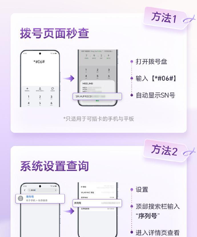 手机的身份标识是什么呢?好多朋友会很困惑,表示手机型号不就是标识嘛,其实手机是有唯一性身份标识,就是SN号,也叫做产品序列号,这个号码就相当于手机的身份证。那么有朋友会追问,这个SN号如何来查询呢?荣耀客服通过图文来解答4种查询方式。 首先是通用方式,各个手机品牌都一样,打开拨号盘,输入*#06 # 就会自动显示SN号。第二种方式就是通过系统设置,输入关键字:序列号,进行查询。第三种方式荣耀手机,通过我的荣耀APP, 底部服务页面来查询。第四种方式通过产品包装盒查找。