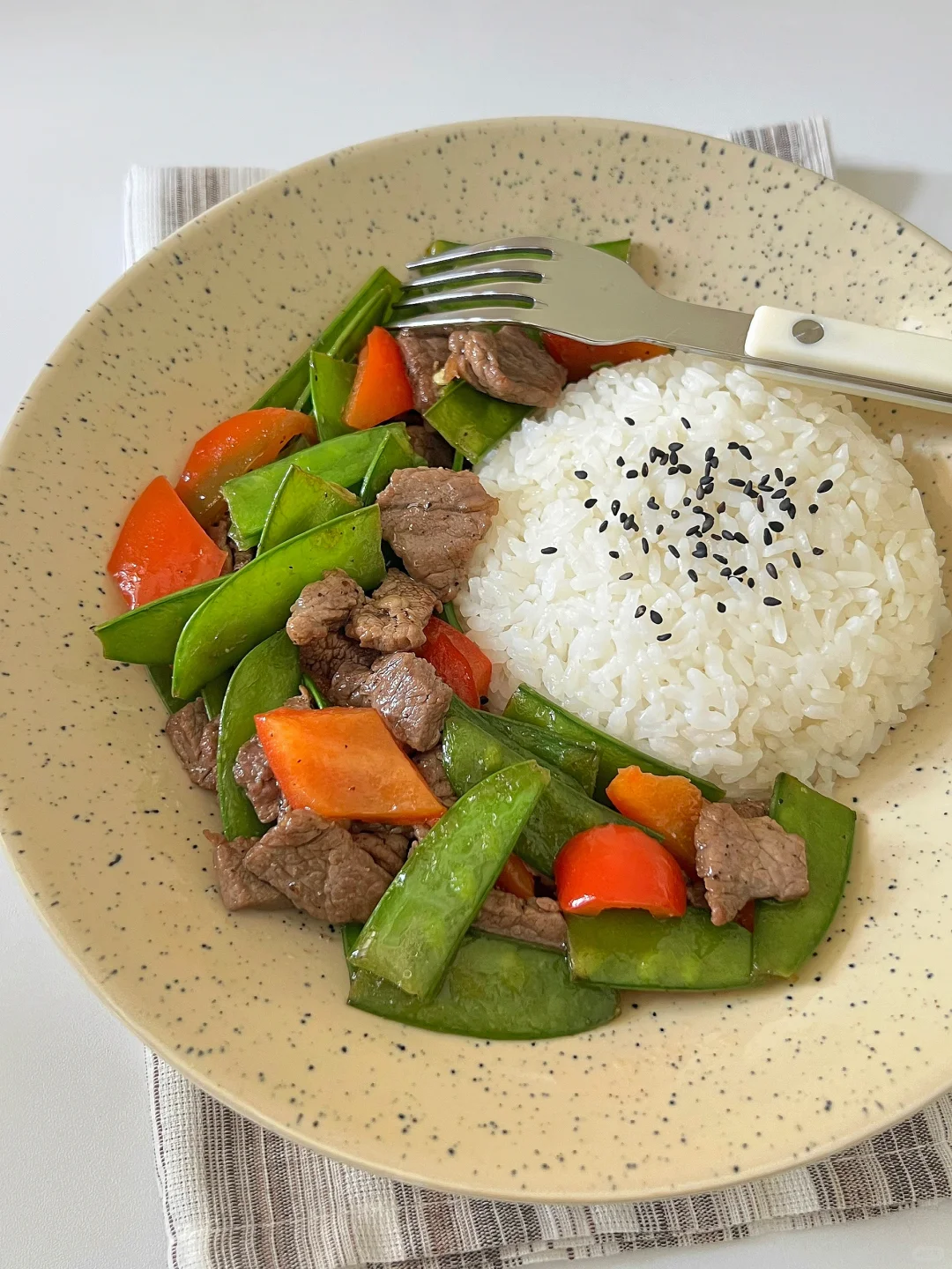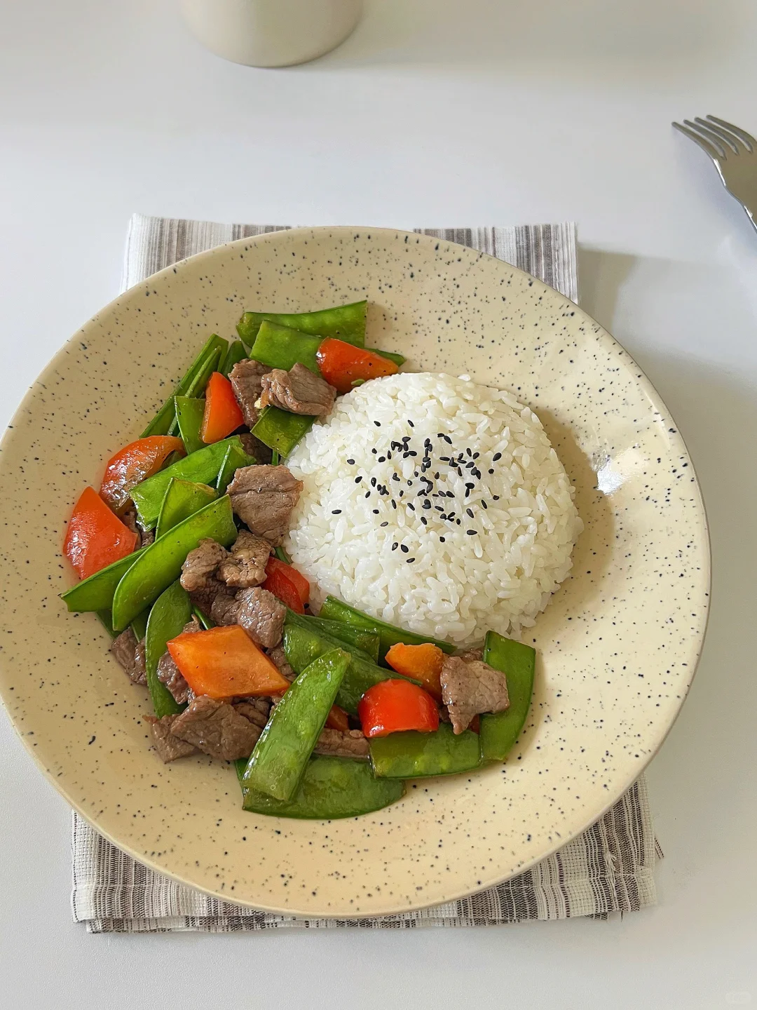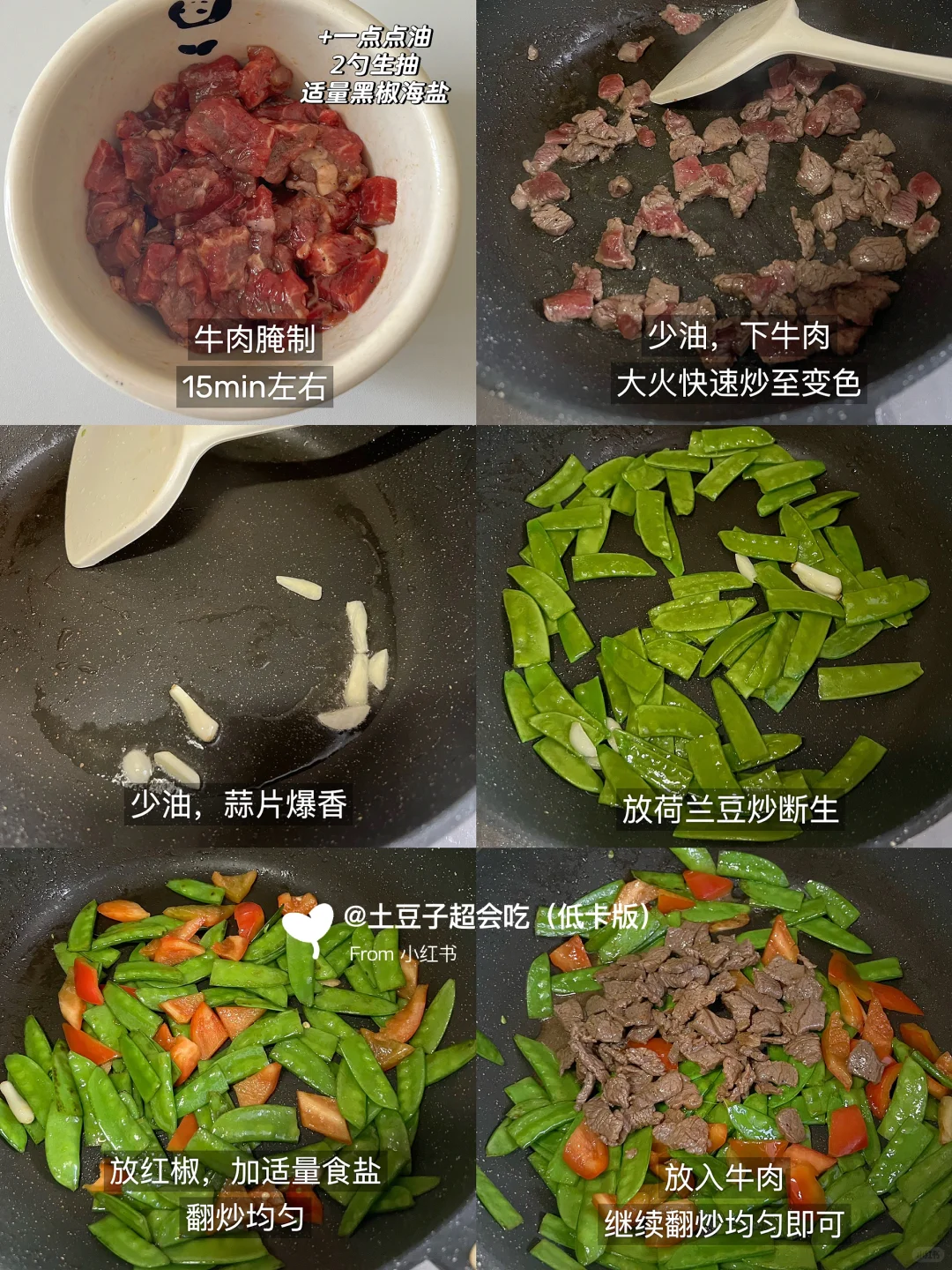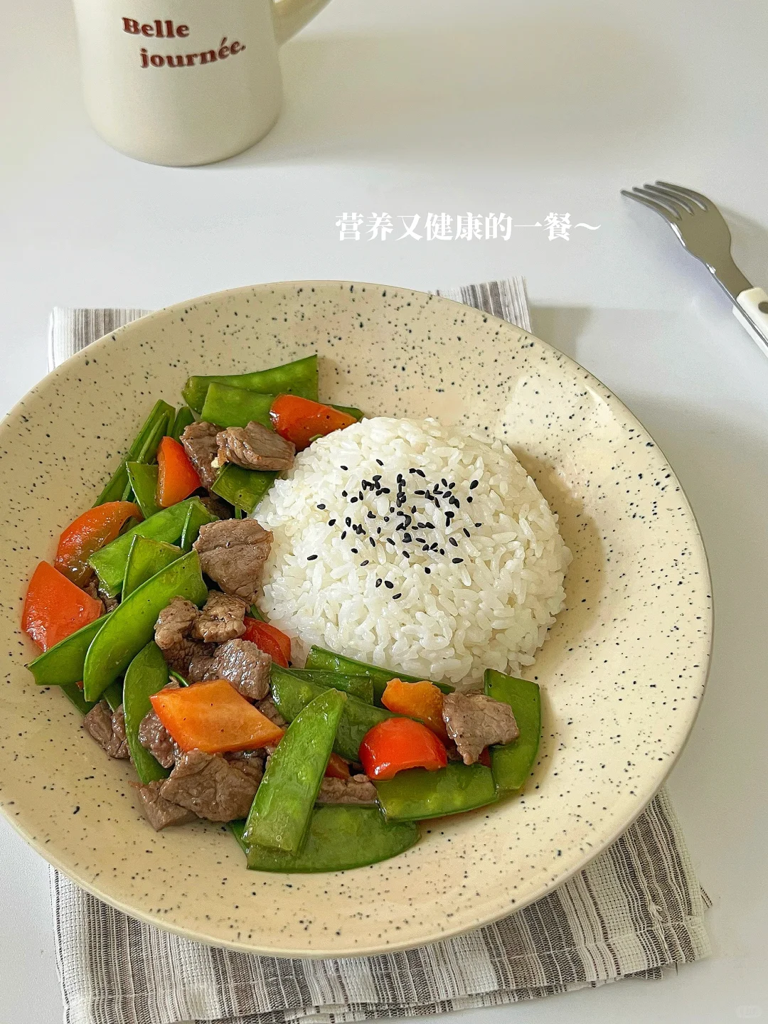 今天的晚餐是一个人的简餐 像这种中式少油少盐小炒菜 算是我缀缀喜欢的减脂餐形式了 好吃又健康,干干净净的~ . 今天吃的是红椒荷兰豆炒牛肉,做起来很简单! . 🫛 食材准备:荷兰豆、红椒、牛肉、大蒜 1️⃣ 牛肉切片,加1点点油、2勺生抽、适量黑椒海盐,抓匀腌制15min左右; 2️⃣ 少油,下牛肉,大火快速翻炒至快熟,盛出备用; 3️⃣ 少油,蒜片爆香,放入荷兰豆炒断生; 4️⃣ 放红椒,加适量食盐,翻炒均匀; 5️⃣ 加入牛肉,快速翻炒均匀即可。