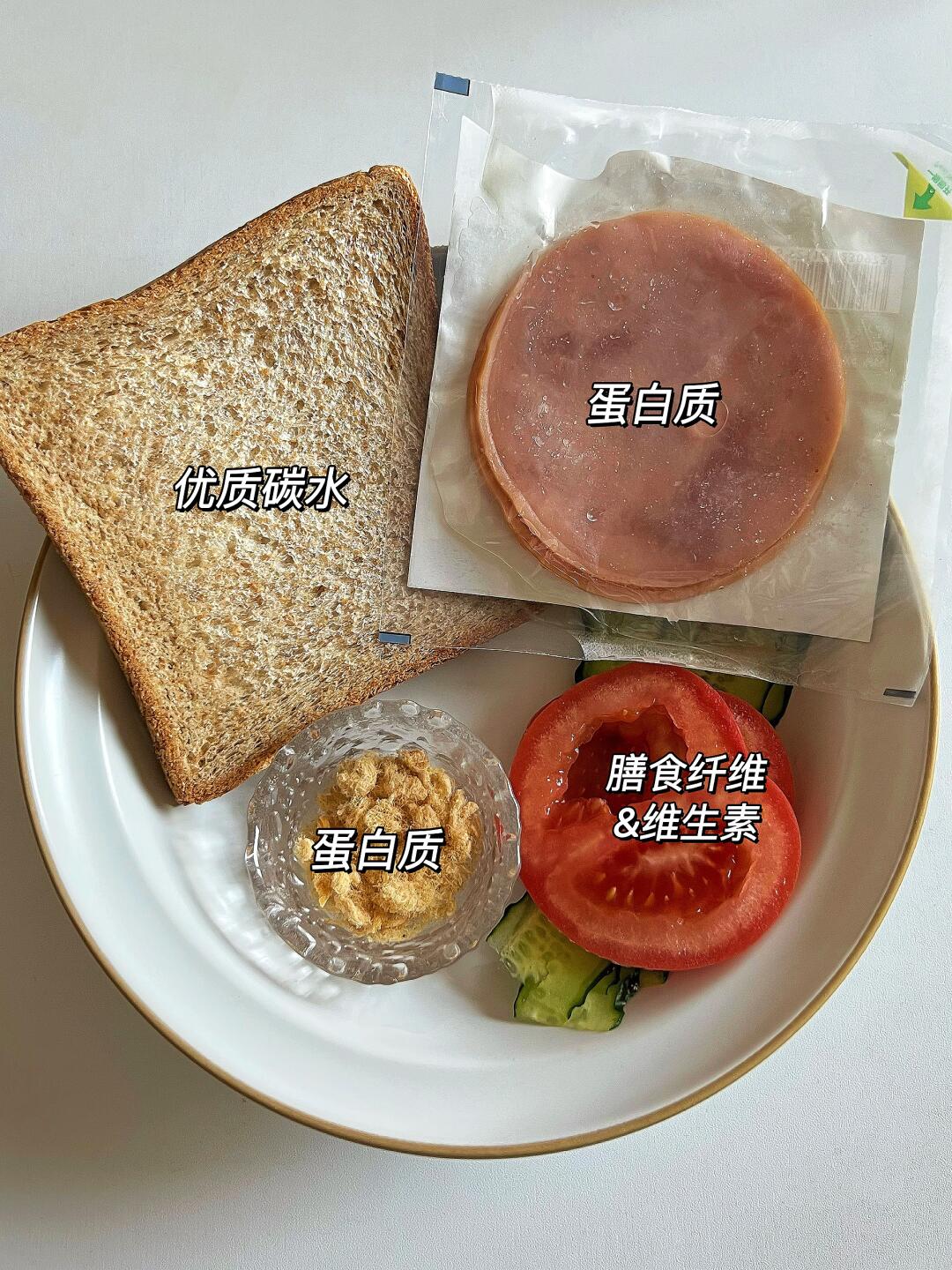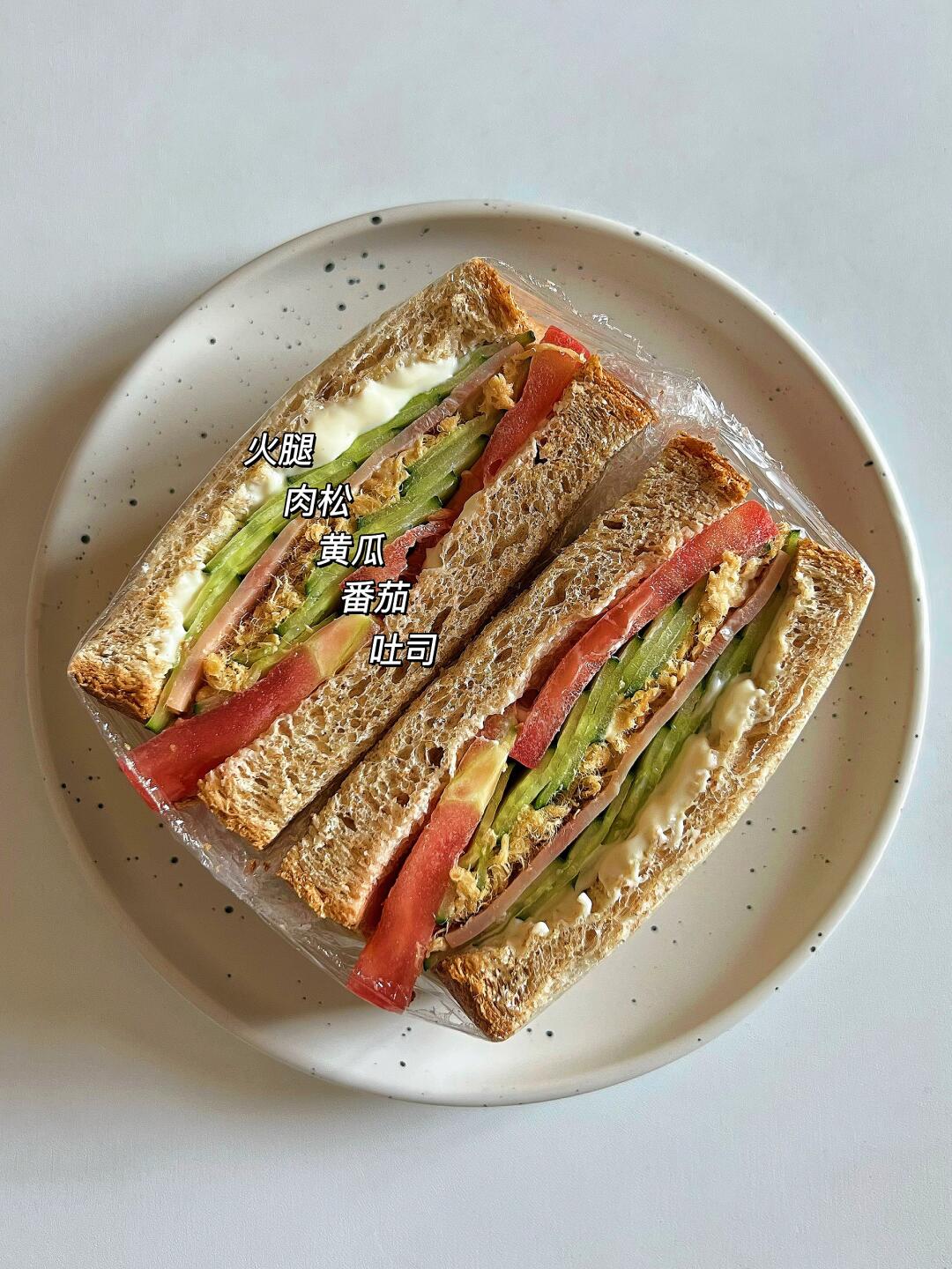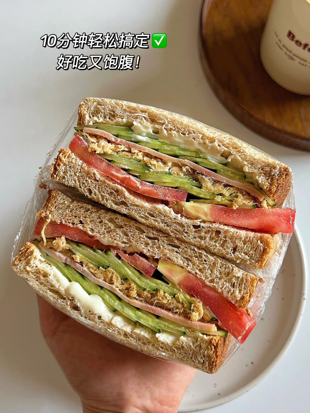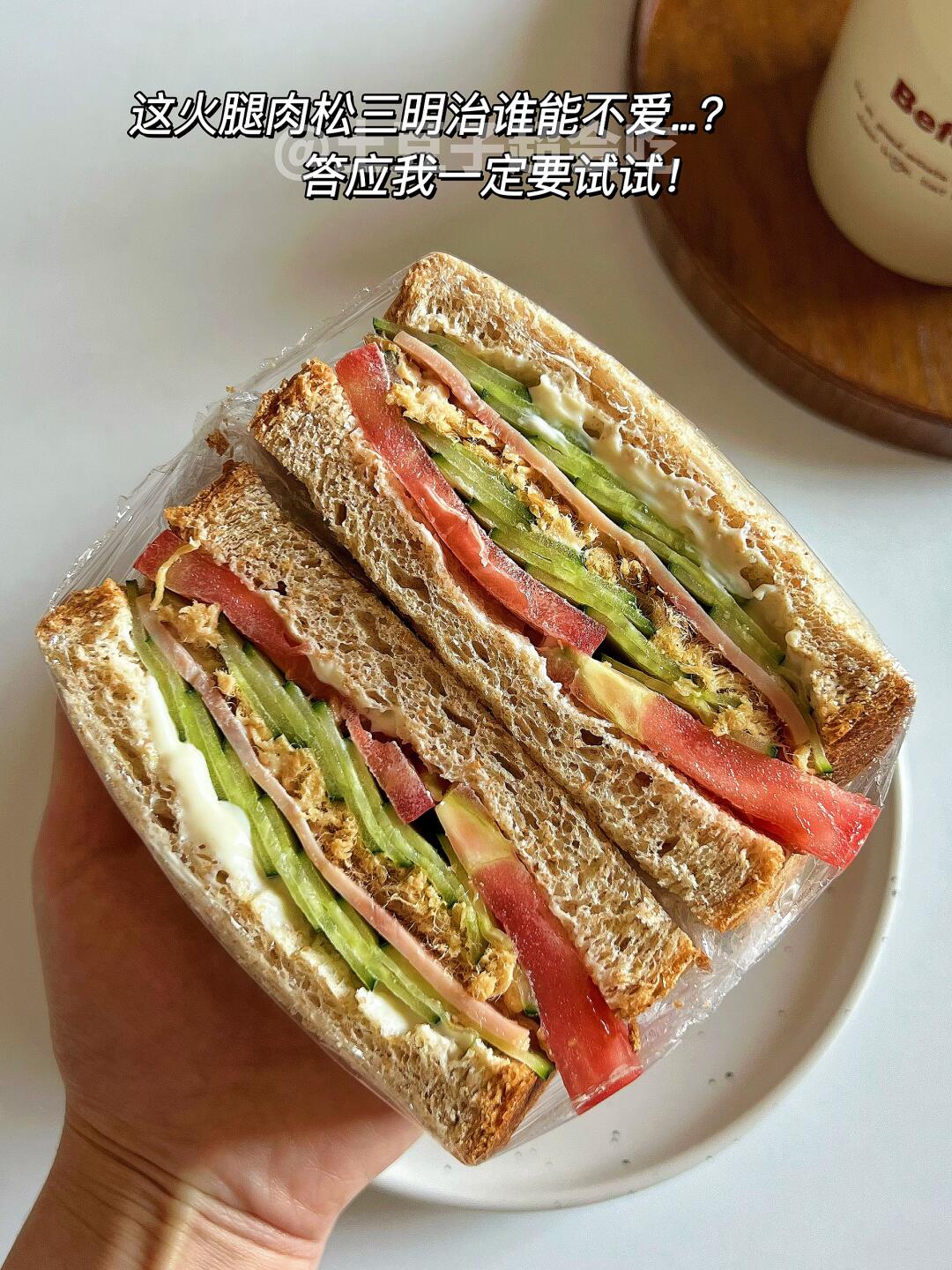 大数据请推给所有 减脂期 的家人们!来试试这个营养均衡的蔬菜火腿肉松三明治~~好吃还高饱腹,十分钟搞定✅ 做好直接揣包里带走[害羞R] 简单又美味! . 🥪 做法如下: 🍅 食材准备:全麦吐司、番茄、黄瓜、火腿片、无糖肉松、低.脂沙拉酱/蛋黄酱 ✅ 具体步骤: 1⃣️ 底部铺一层保鲜膜,放一片吐司,挤上适量沙拉酱; 2⃣️ 依次放一层黄瓜片、一片火腿,再挤上少许沙拉酱; 3⃣️ 依次放一层无糖肉松、一层黄瓜片、一层番茄、一片吐司; 4⃣️ 用保鲜膜包起来,切开即可享用。