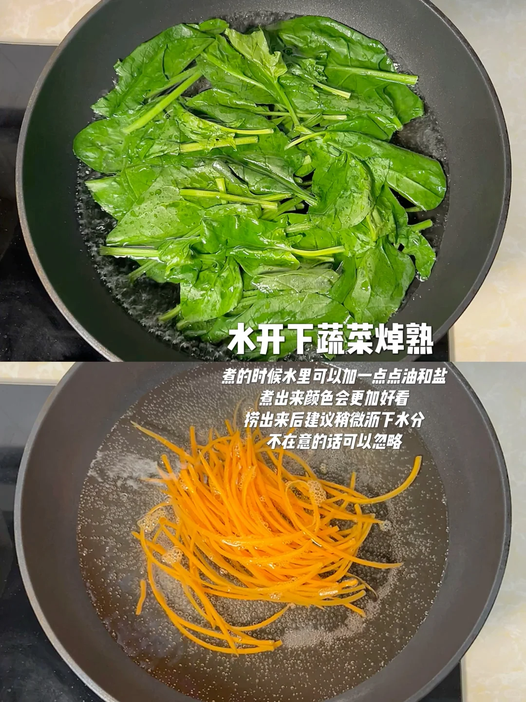 4⃣️ 锅中加水,蔬菜焯熟,捞出备用;锅中加水,面条煮熟捞出;