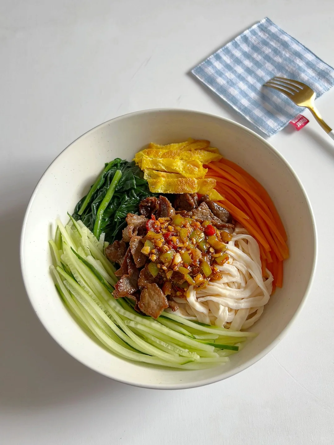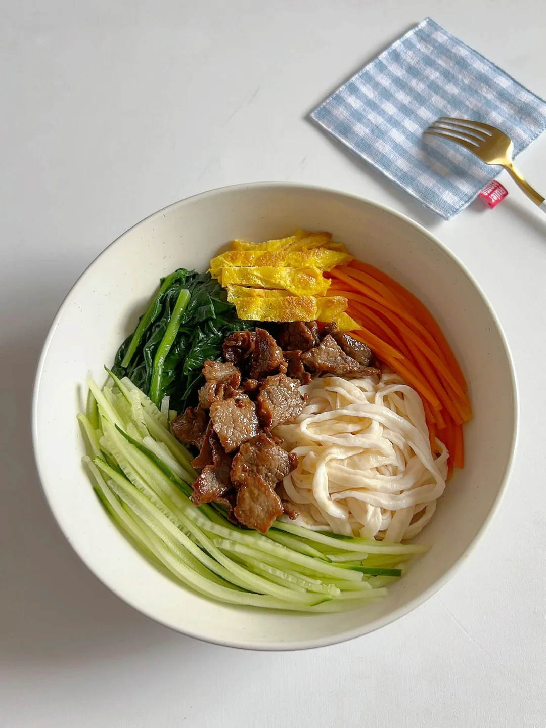 🥒 食材:牛肉、鸡蛋、黄瓜/菠菜/胡萝卜、面条
