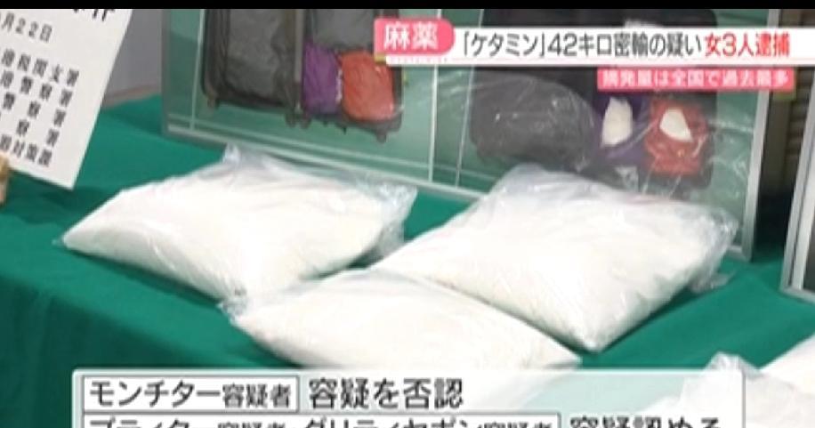 三人涉嫌在一架从新加坡飞往福冈机场的飞机上携带三个装有42公斤氯胺酮的行李箱,。氯胺酮用T恤和其他衣服包裹住,并在每个行李箱里放三到四个袋。 针对警方的调查,嫌疑人否认了指控,称“是我带来的,但它不是我的”,并在随后的调查中保持沉默。 另一人也否认了指控,称“我不知道里面有什么”,但在随后的调查中又说,“我知道这是一种毒品”。 三人中有一人承认了指控,说:“我承认这是一种非法药物”。 警方正在调查是否存在团伙参与。