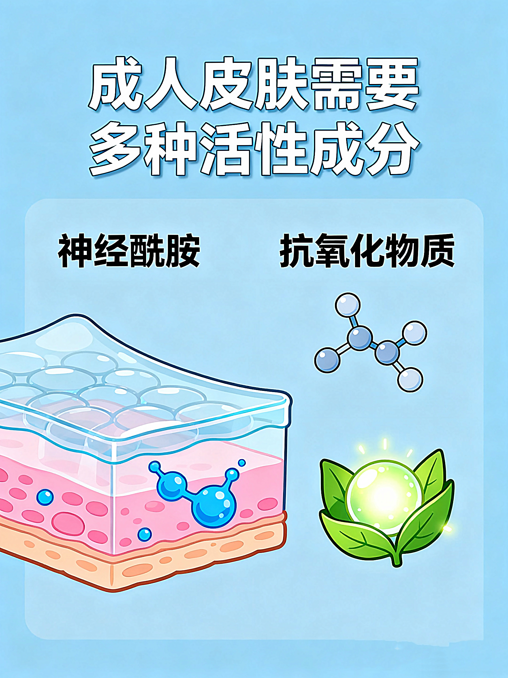 · 神经酰胺:修复屏障,锁住水分(婴儿霜含量低,不够成人流失速度); · 抗氧化物质(如维生素C、E):对抗自由基,延缓老化; · 肽类与烟酰胺:促进胶原再生,改善暗沉和弹性; · 必需脂肪酸(如Omega-3):维持细胞膜健康,抗炎维稳。