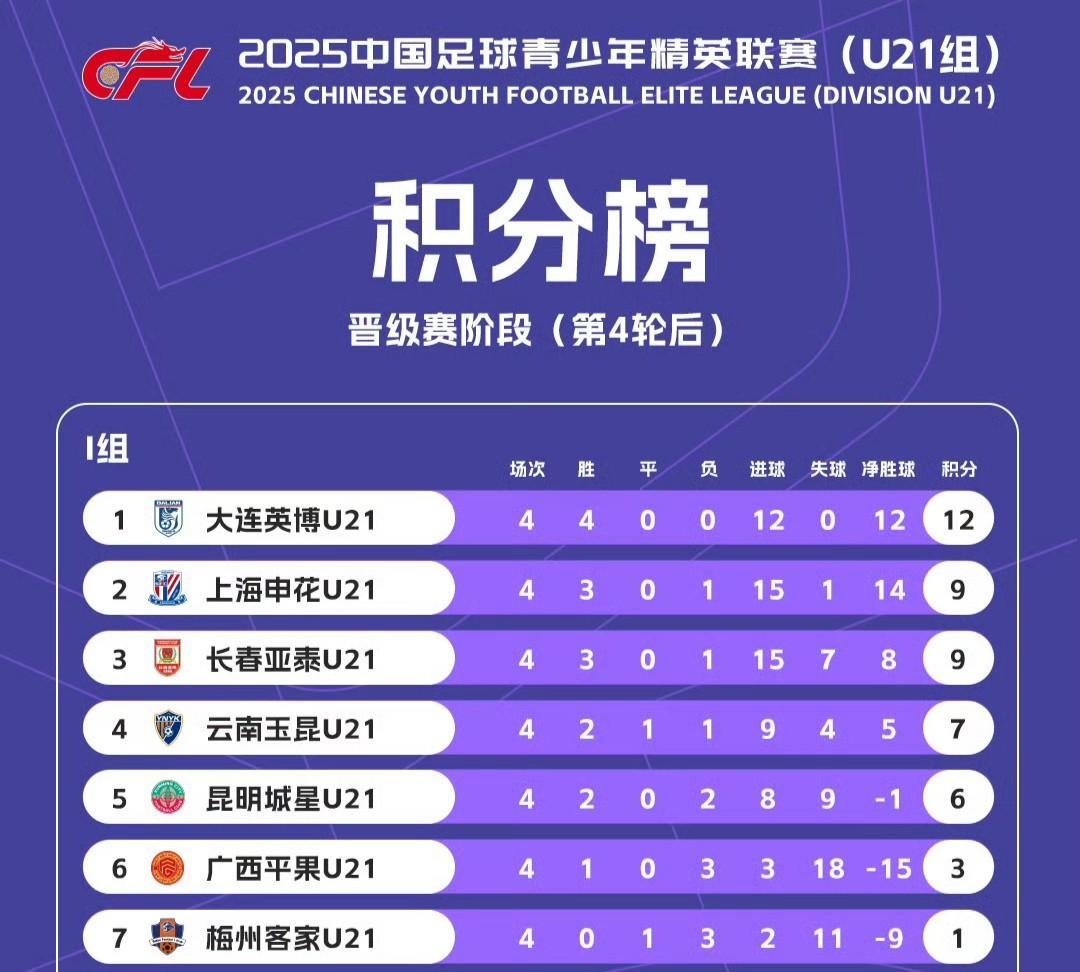 中国足球U21精英联赛最新积分榜! 中国足球U21联赛第四阶段进行了4轮比赛,两个小组的最新排名如下! 由于泰山,海港,蓉城,三镇四支球队的U21均已参加中乙联赛,因此,从这个榜单没有看到他们! 不过大连英博U21还是让人眼前一亮,四战全胜,不失一球的成绩也显示出足球城的底蕴! 当然申花也依然是青训的主力军,期望最后能走新的球队再参加中乙联赛。 #中国足球# #u21青年联赛# #u21足球联赛# #说说足球的未来#