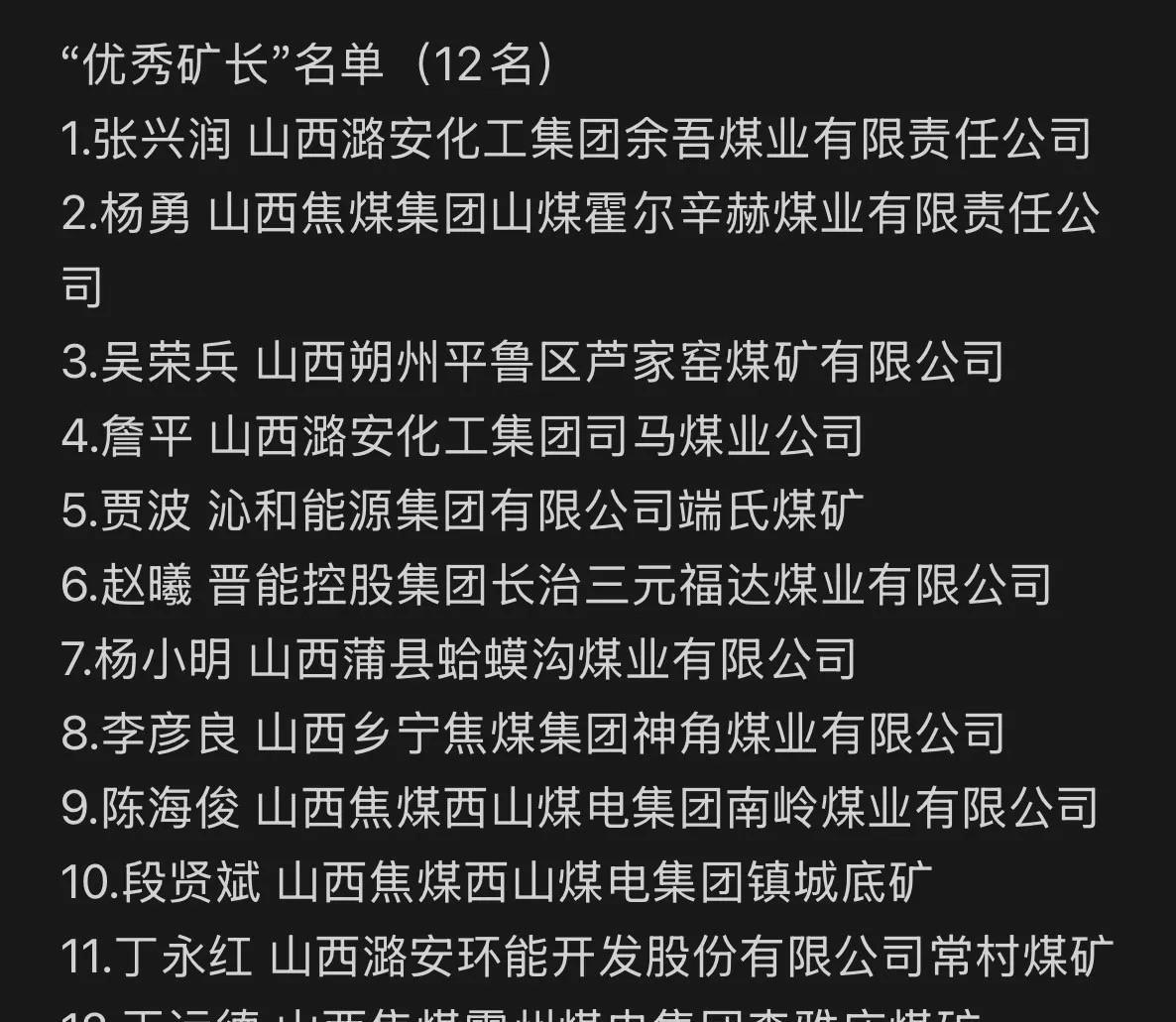 人杰地灵的山西,真是个培养优秀矿长的地方呀。请看! 被煤炭工业协会评选出的2024年度12名优秀的矿长都是我们山西的,山西真是个出管理煤矿人才的地方呀,山西的煤炭资源不仅丰富,山西的管理人才也是非常的优秀呀。这个评选出的12位矿长遍布山西的大江南北各个集团各个煤矿,都是万里挑一的优秀煤炭管理人才。他们为我们山西的煤炭工业做出了杰出的贡献。真的为我们山西人骄傲呀!