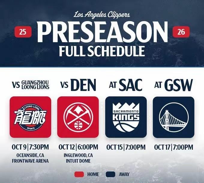 还有一周就快船媒体日了,真快啊,期待季前赛和广州队的比赛,更期待拿下常规赛首胜! 9月30日,快船媒体日开启,比尔、柯林斯、保罗、大洛将悉数亮相,登卡祖也会拍新赛季定妆照,博格丹也将健康归来,真好真好! 10月1日,快船全体在英格尔伍德开始训练营 训练营的红蓝军战术演练后,将迎来一共四场季前赛,首战是在加州Frontwave球馆对阵广州龙狮队!这是常规赛开启前,球队的第一次实战演习! 10月23日,快船首场客战爵士队,柯林斯、邓恩将在老东家面前打比赛,务求首胜! #快船# #快船队# #快船队赛程安排#