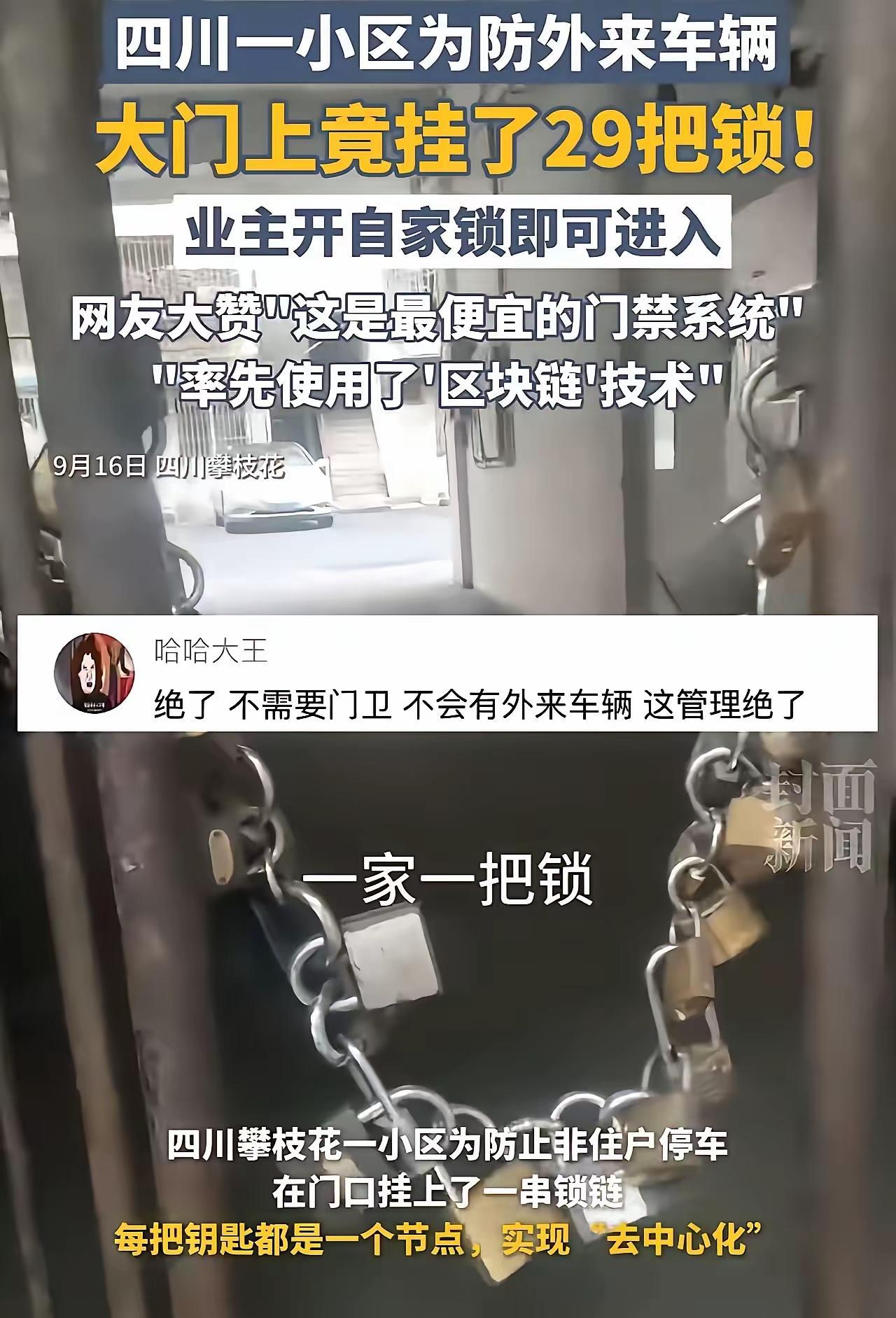 妈呀,太聪明了,真的是高手在民间! 四川攀枝花一个物业小区里,由于没有保安看门,经常有一些外来车辆进入小区停车,给小区造成了不安全的隐患。 业主们经过商量,在上面挂了29把锁,形成了“区块链”,只要回家,直接打开自己的一个锁头即可,真的是太聪明了! 既可以防住外来车的打扰,又保证了自己的安全,高手,实在是高手!