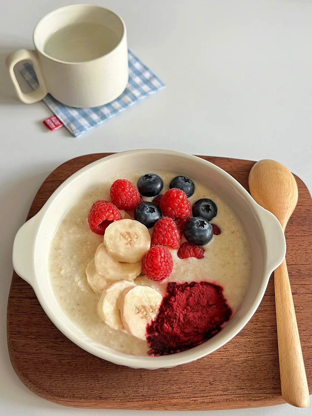 今天吃的是香蕉莓莓豆乳燕麦碗🫐