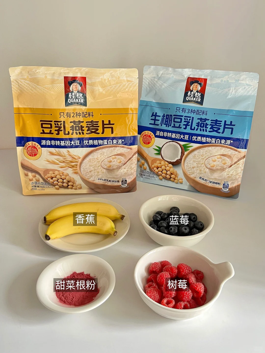 🍓 食材:桂格豆乳燕麦/桂格生椰豆乳燕麦、香蕉、树莓、蓝莓、甜菜根粉