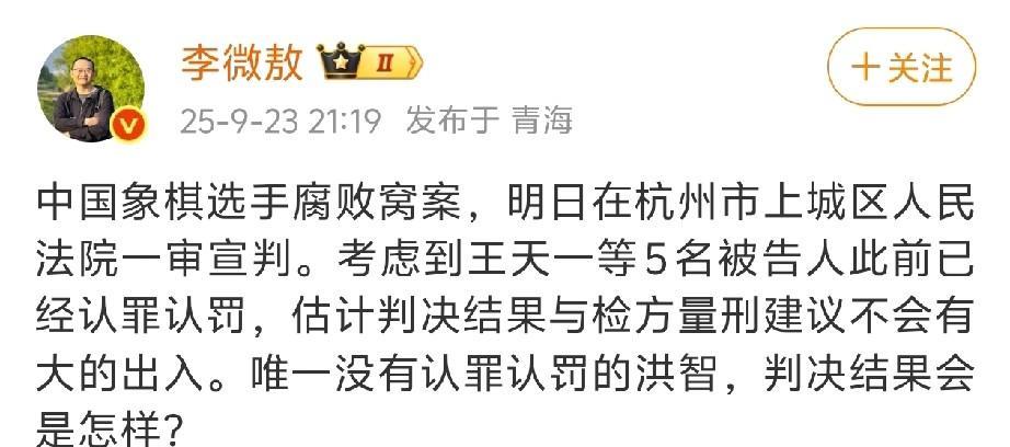 2025录音门重磅消息,李微敖报道,中国象棋买卖棋案,明天一审宣判!天一可能输了?洪智结局会怎样? 王天一赵鑫鑫徐超王跃飞谢靖5人认罪认罚,估计与建议量刑出入不大,只有洪智并未认罪认罚,那么他能否逃出生天呢?他的辩护律师——孙晓洋亲赴杭州,背水一战,最终能否力挽狂澜? 明天一审宣判,就有结果了!所有棋迷拭目以待!