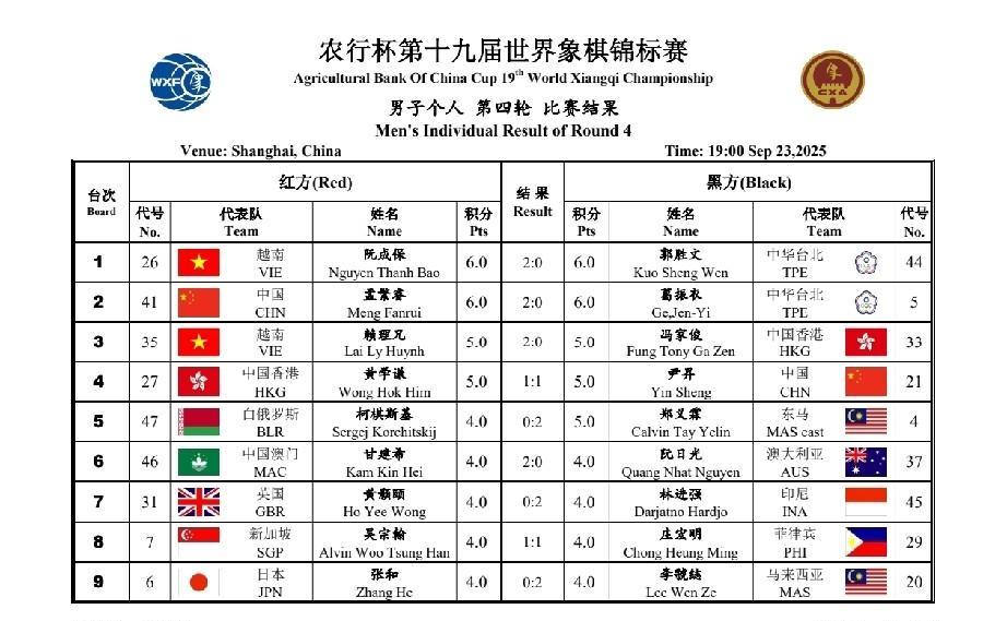 2025世锦赛第四轮战报:孟繁睿阮成保8分领跑,赖理兄7分奋力追赶! 尹昇6分加油!如果明天孟繁睿拿下阮成保,团体可夺冠! 今晚没有女子比赛,7轮,男子9轮! 冯家俊没事找事,赖理兄建功立业!明天就看孟繁睿的了!