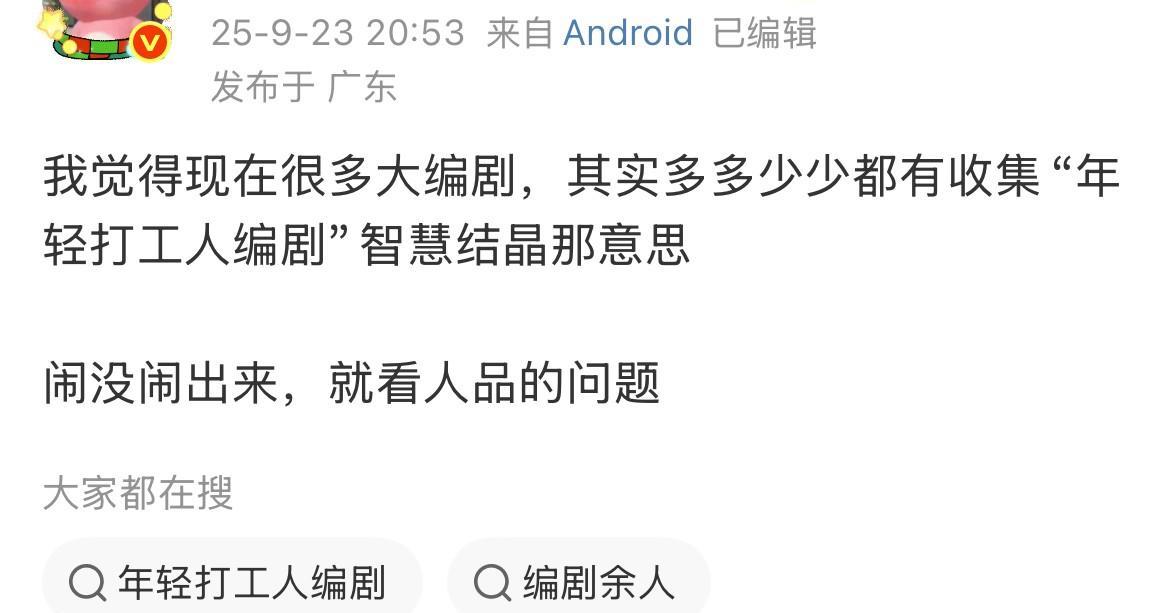 现在很多大编剧,其实多多少少都有收集“年轻打工人编剧”智慧结晶那意思 闹没闹出