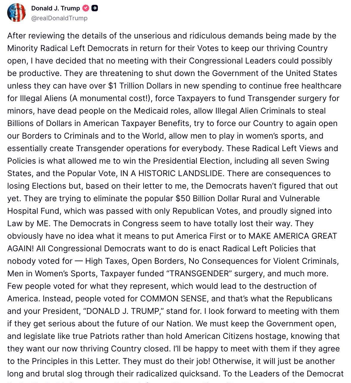 特朗普拒绝与国会民主党人举行政府资金会议,直到为避免政府关门而提出的“不严肃且荒谬的要求”被撤回:
