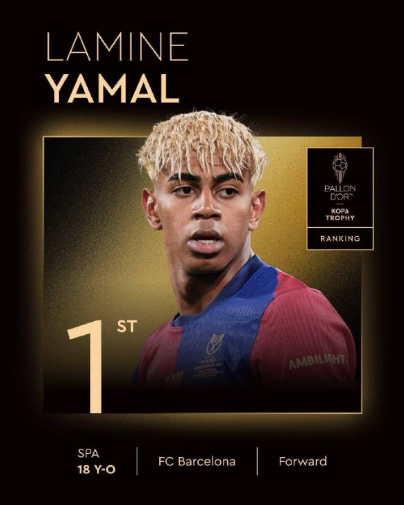 2025年金球奖颁奖典礼今日进行,18岁的西班牙前锋亚马尔获得科帕奖,连续两年获得该奖项,巴萨球员5年4获奖。