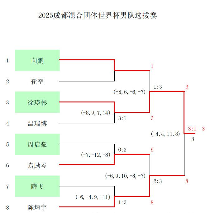 9月22日,男队队内选拔赛打响。首轮,向鹏轮空,徐瑛彬3比1胜温瑞博,袁励岑3比0胜周启豪,陈垣宇3比1胜薛飞;半决赛中,徐瑛彬3比1胜向鹏,陈垣宇3比2胜袁励岑;决赛开始后,两人各胜1局,徐瑛彬在关键的第三局把握住机会13比11取得领先,进而3比1拿下比赛,首次获得混合团体的参赛资格。