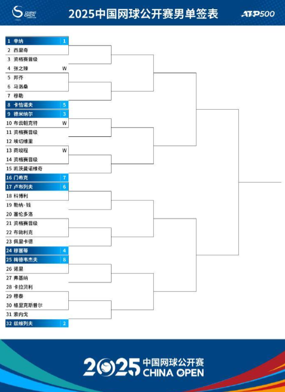 中网男单签表出炉,中国男单选手均在上半区,布云朝克特首轮对阵三号种子德米纳尔;张之臻、商竣程首轮迎战资格赛选手。 前八种子对位如下: 辛纳(1)vs 卡恰诺夫(5) 德米纳尔(3)vs门希克(7) 卢布列夫(6) vs 穆塞蒂(4) 梅德韦杰夫(8)vs 兹维列夫(2)