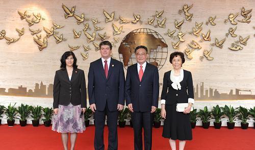 2010年10月1日,吴邦国和夫人章瑞珍在上海世博中心东门大厅迎候前来出席上海世博会中国国家馆日仪式的贵宾。这是吴邦国夫妇与阿尔巴尼亚总统巴米尔·托皮夫妇合影。