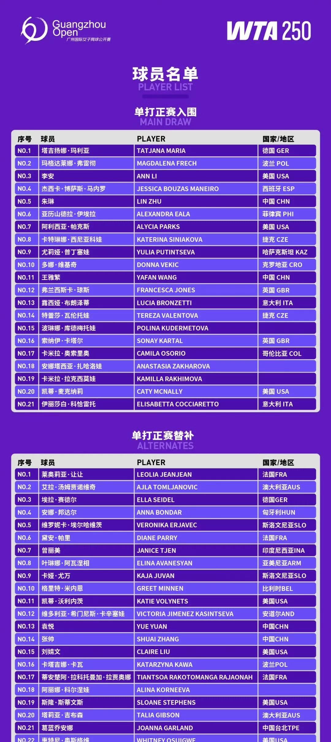 【2025广州WTA250赛女单:朱琳王雅繁入围】 完整女单正赛入围及替补名单如