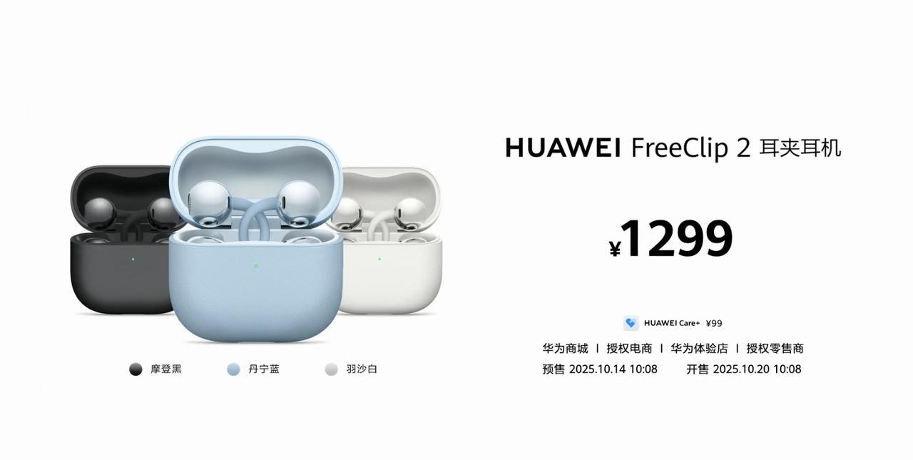 华为 FreeClip 2 发布,售价 1299 元。 - 芯片:华为自研第三代音频芯片,搭载 NPU AI 处理器,算力提升 10 倍 - 声学:Φ10.8 开放式双振膜声学单元,响度提升 100%,低频动力提升 100% - 音频编码:L2HC - 功能:支持智感音量自适应、智感人声增强、空间音频(头动跟踪时延降低 40%)、2025 年年底升级星闪音频体验(搭配华为 Mate 80?) - 舒适性:升级亲肤液态硅胶材质,搭配高性能记忆金属,柔软度提升 25%,单耳重 5.1g,耳机支持 IP57 防尘防水; - AI:新增鸿蒙 AI 耳边助手,支持头动播报、智慧播报、小艺唤醒、小艺翻译; - 续航:耳机 60mAh 电池,单次使用 9 小时;耳机仓 537mAh 电池,续航 38 小时,充电 10 分钟,使用 3 小时; - 其他:丹宁蓝、羽沙白、摩登黑 3 款配色,支持星闪精确查找。