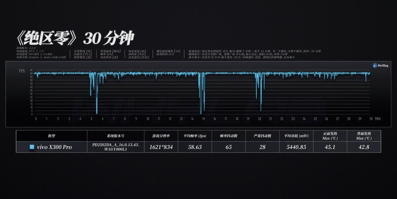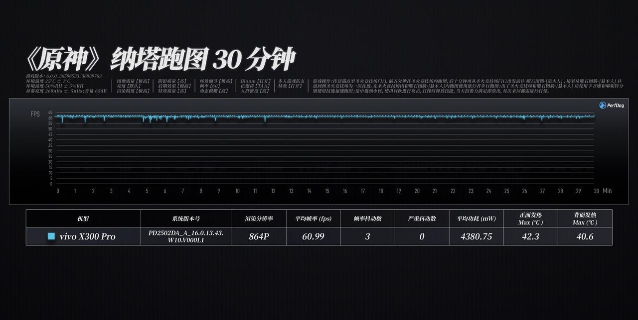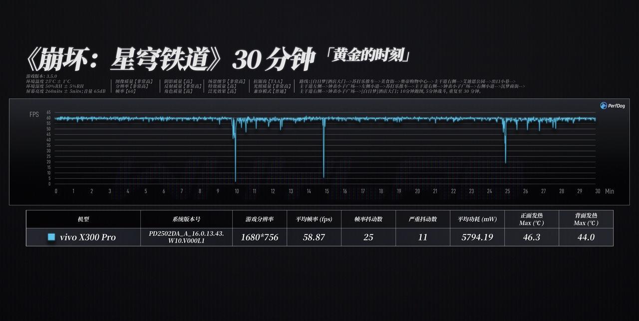 #WHYLAB数据库# 新增 vivo X300 Pro 游戏实测数据 今年 N3P 的天玑 9500 表现好的出乎意料,简单总结就是,性能稳步提升,功耗持续走低,等明年制程跃进到 2nm,收益应该会更加显著。[灵光一闪] 游戏实战,首先是「王者荣耀」,极高帧率 + 极致画质,15 分钟全程是顶穿了 120fps 满帧来跑的,重点是功耗,只有 3.2W,机身最高还没到 37℃,对天玑 9500 来说太轻松了。 「原神」半小时纳塔,864p 分辨率,60.99fps,曲线可以说是「毫无波澜」,功耗只有 4.4W、背面温度也就 40℃ 多一点,是挺稳的。 「星铁」的话,半小时「黄金的时刻」跑图加打怪,756p 分辨率,帧率能接近 59fps,表现相当不错了,看帧率曲线,全程一共也就 11 次比较严重的抖动,基本上是只有打怪转场的时候出现一定的掉帧,重点是转场之后恢复得比较快,其余几乎都是顶满帧率来跑的。功耗 5.8W,比之前测的工程机 6.1W 还要低,背面最高温也就 44℃。vivo 配天玑 9500 确实有两把刷子的。 「绝区零」也类似,都是半小时跑图打怪,834p 分辨率,帧率 58.63 fps,功耗也就 5.4W,背面不到 43℃。