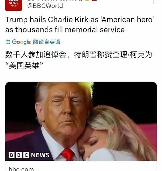 BBC也挺会配图片的啊! 配文是“数千人参加追悼会,老特称赞柯克为美国英雄”,但是却配个柯克遗孀依靠在老特肩膀上的图片。是想表达老特对盟友家属的关心之情吗? 我觉得这张照片老特表情还处于没完全释放的状态,不如换我这张露大白牙的,多自然的表情…