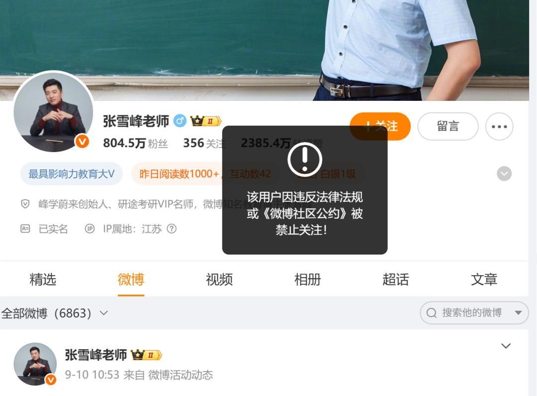 张雪峰多个账号被禁止关注。 张雪峰的微博、小红书、抖音、B站均被禁止关注。这是要