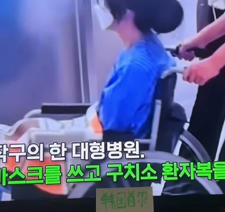 有民众拍到尹锡悦和金建熙从首尔看守所去医院的画面。都穿着囚服,都戴着口罩,都戴着银手镯,都用毛巾盖着,都戴着电子脚镣,都坐着小轮椅,一样一样的。