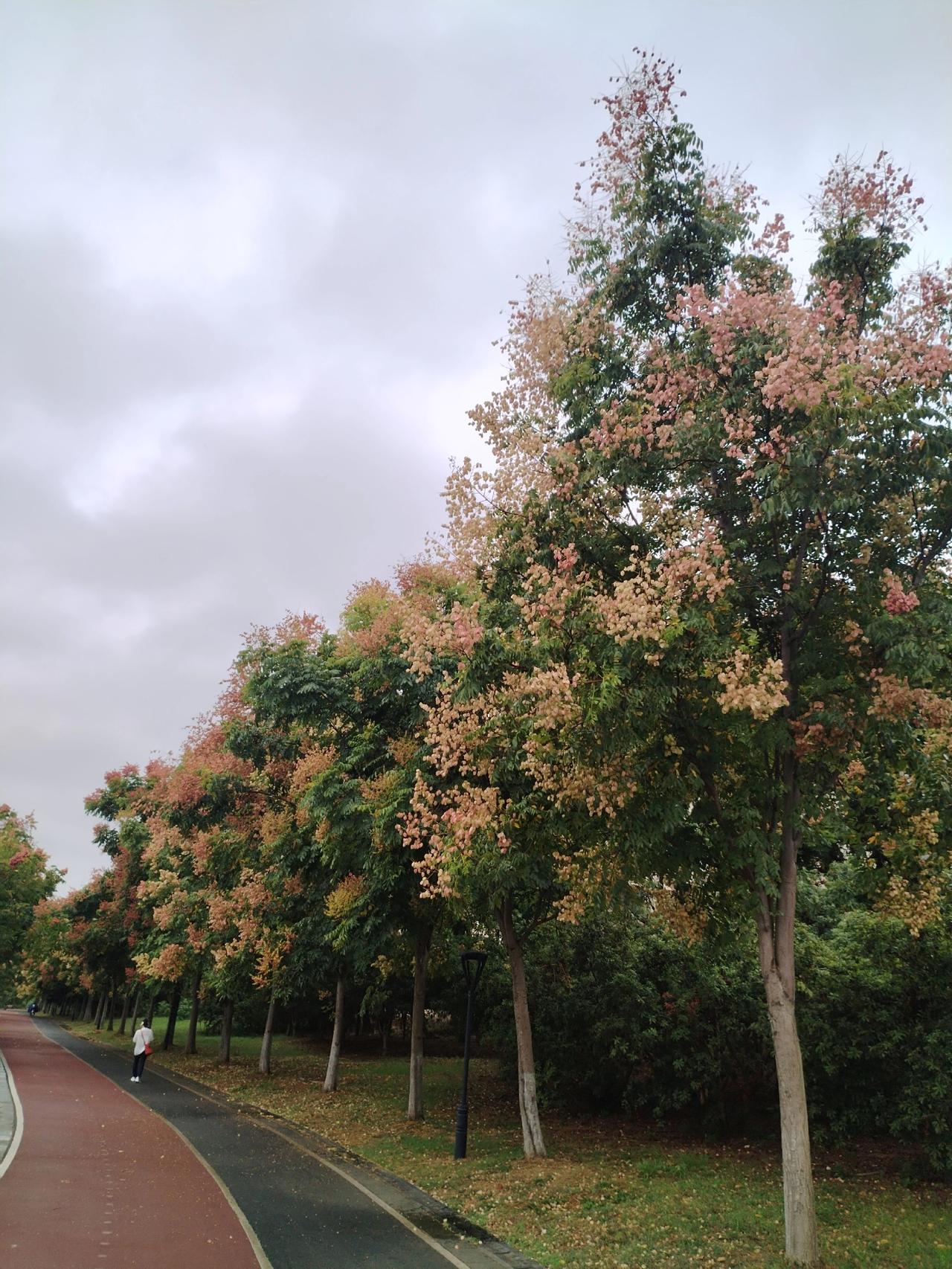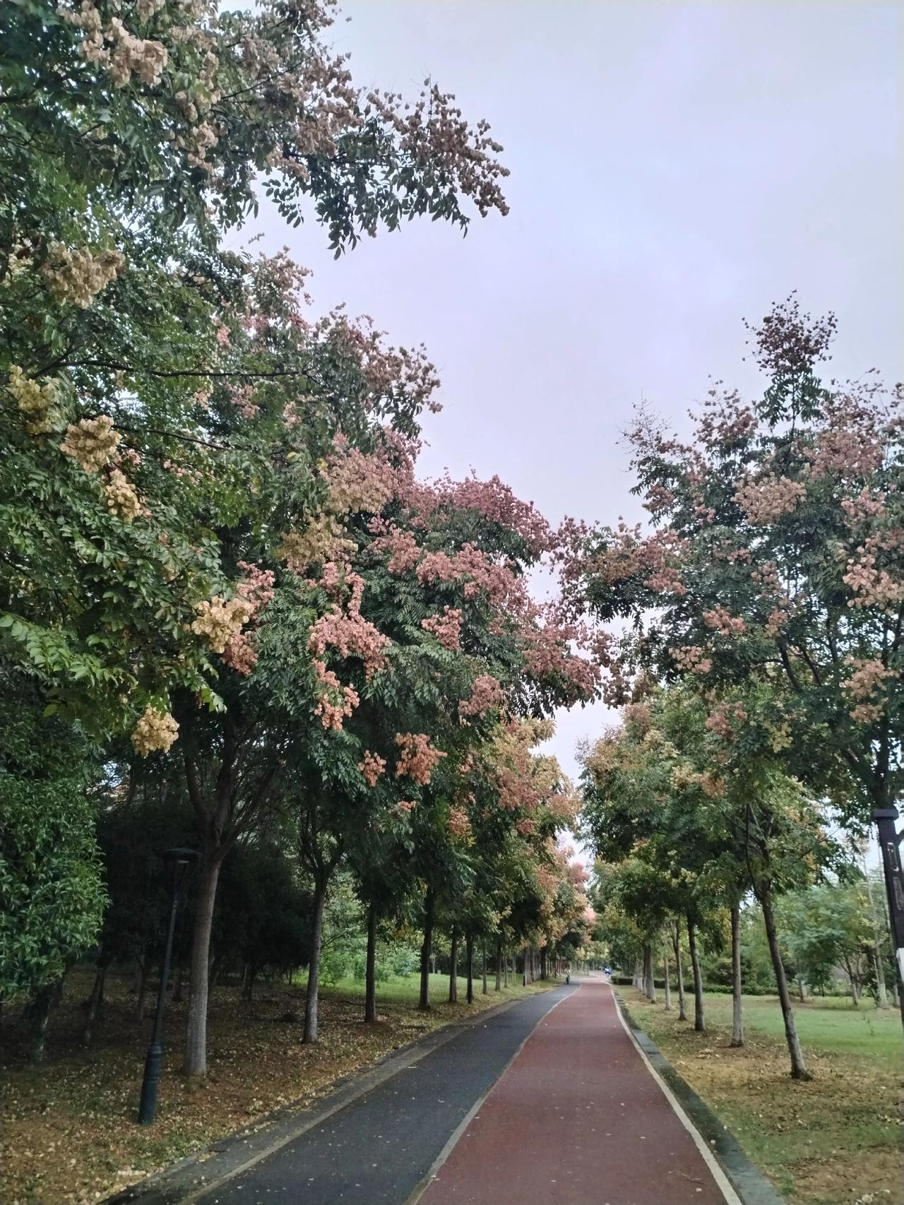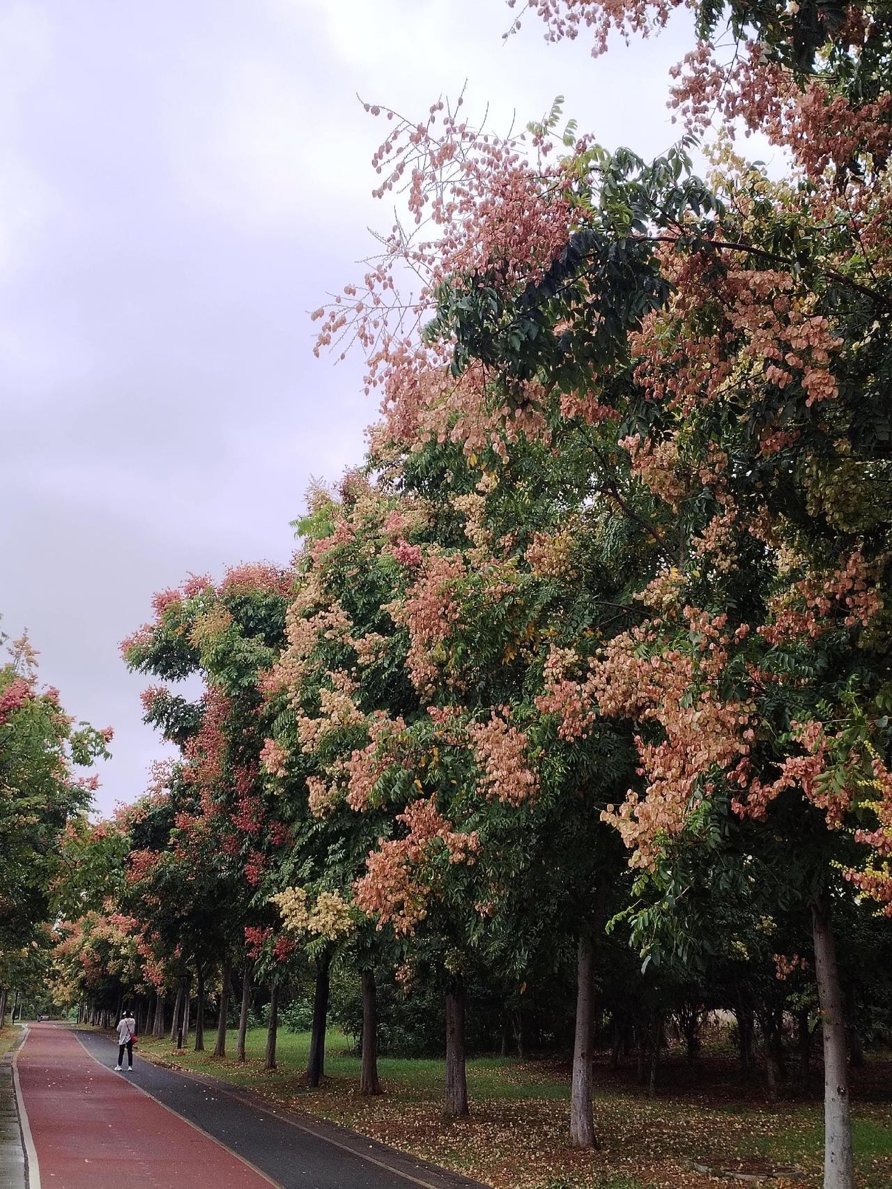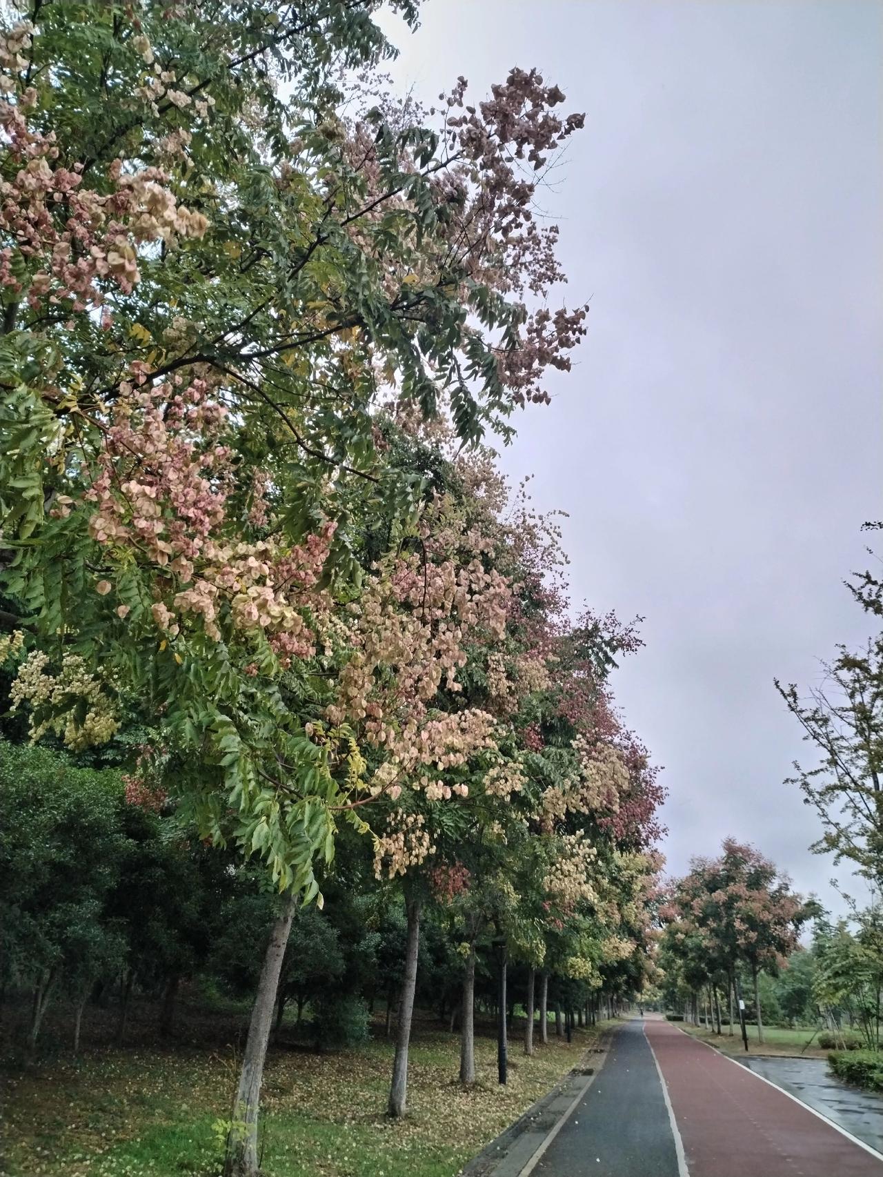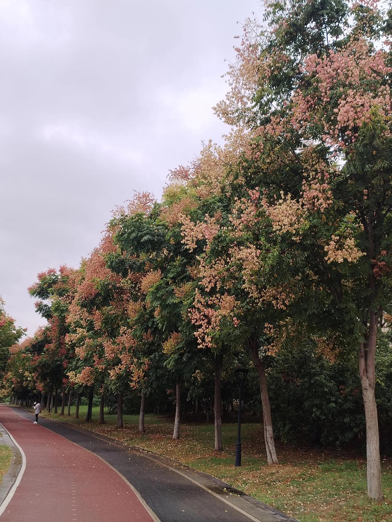 深秋的南昌,天高云淡,阳光褪去了盛夏的炽烈,变得温煦而明亮。信步于城东的一处公园绿道,却恍若踏入了一幅浓墨重彩的油画之中。 道路两旁,成排的栾树正迎来它们最绚烂的季节。这些自然的舞者,枝头仿佛打翻了调色盘: 黄的如金,红的似火,间或点缀着尚未褪尽的绿意。 那黄色的小花簇拥成穗,在微风里轻轻摇曳; 红褐色的蒴果则像一盏盏小灯笼,缀满枝头,与绿叶交织出缤纷的韵律。 南昌网红打卡地 南昌网红 南昌 秋天