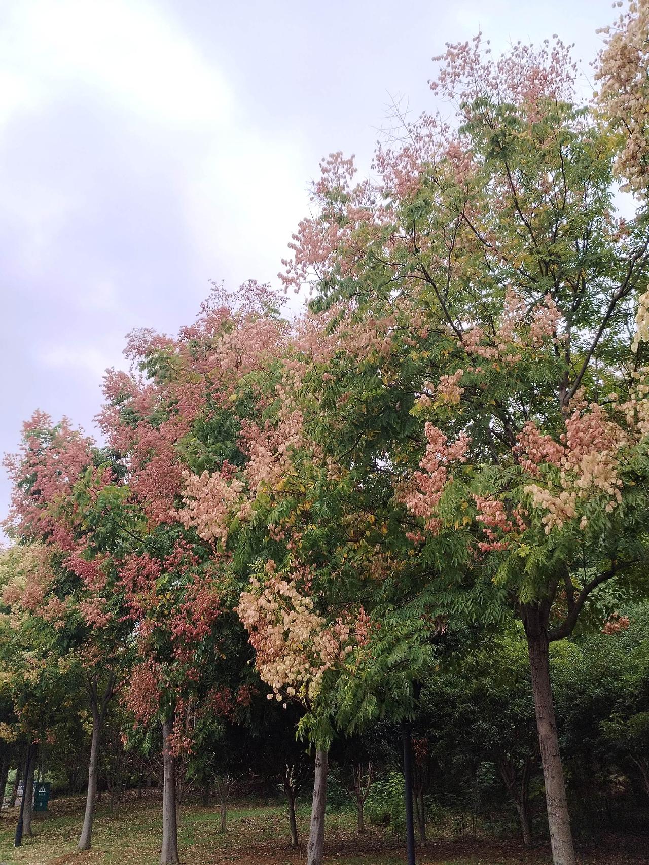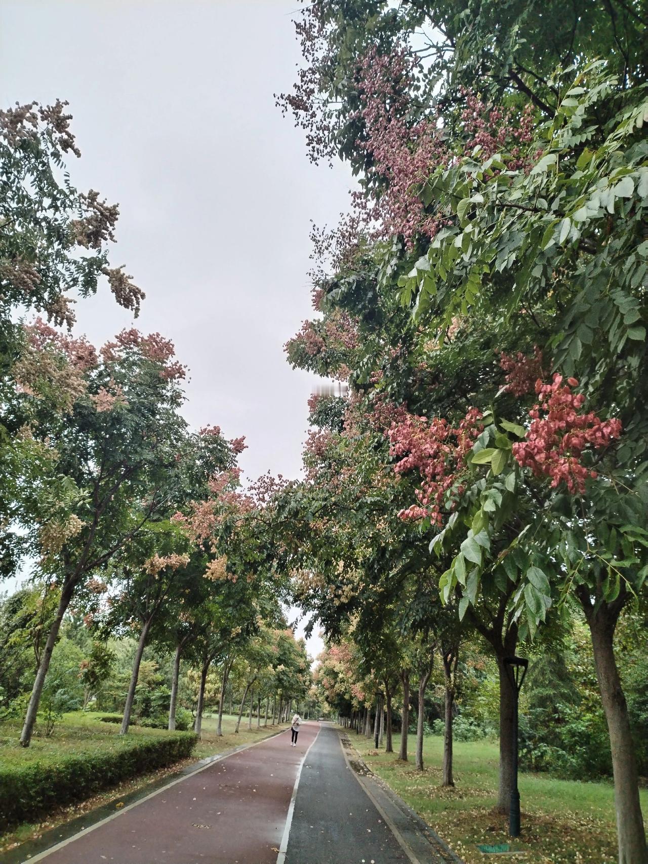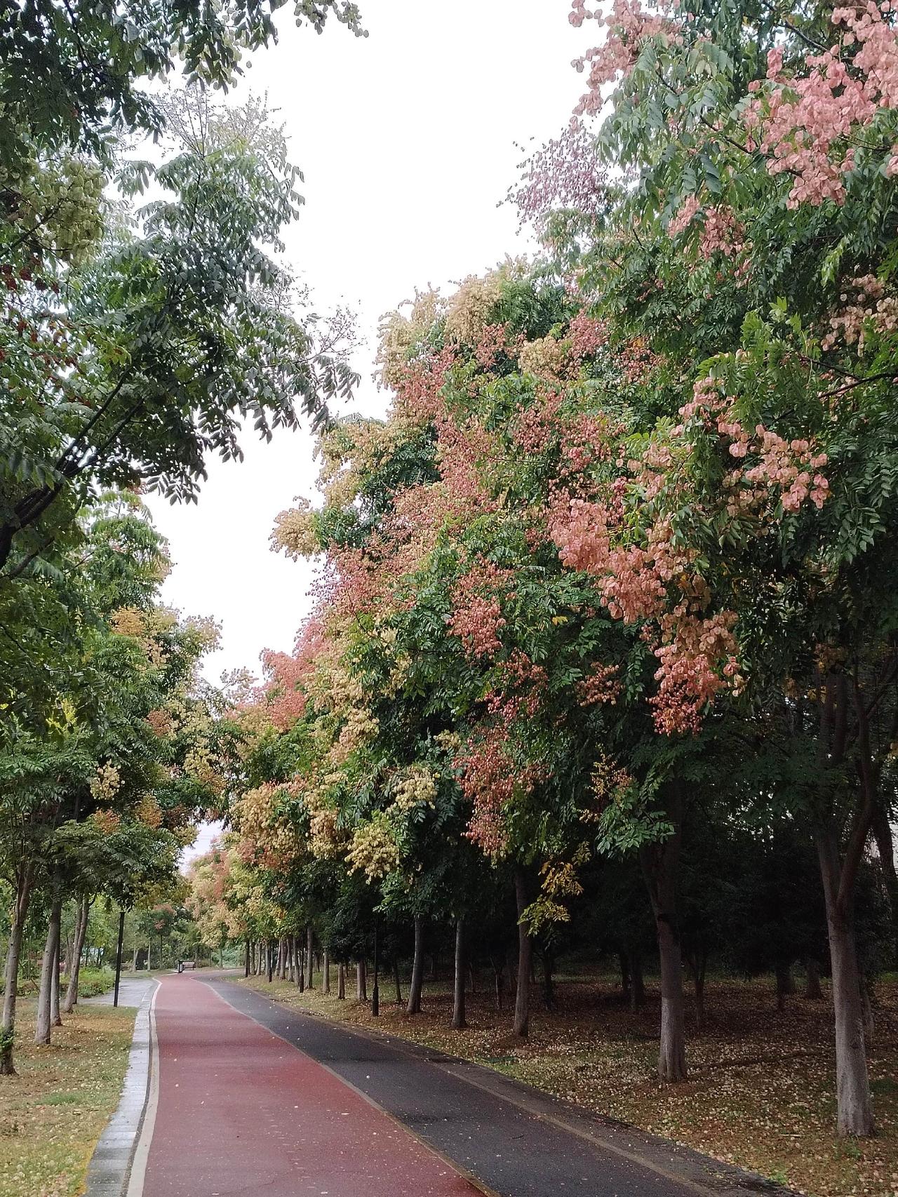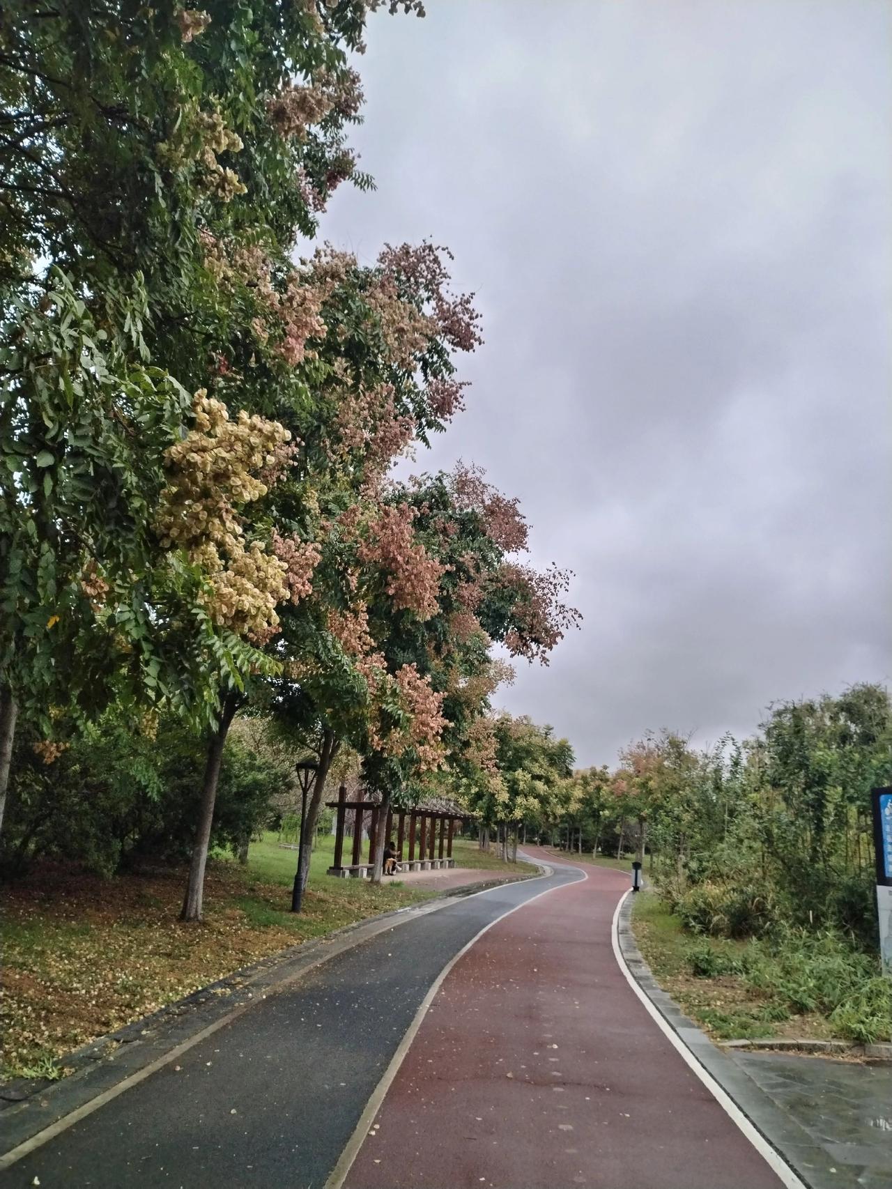 深秋的南昌,天高云淡,阳光褪去了盛夏的炽烈,变得温煦而明亮。信步于城东的一处公园绿道,却恍若踏入了一幅浓墨重彩的油画之中。 道路两旁,成排的栾树正迎来它们最绚烂的季节。这些自然的舞者,枝头仿佛打翻了调色盘: 黄的如金,红的似火,间或点缀着尚未褪尽的绿意。 那黄色的小花簇拥成穗,在微风里轻轻摇曳; 红褐色的蒴果则像一盏盏小灯笼,缀满枝头,与绿叶交织出缤纷的韵律。 南昌网红打卡地 南昌网红 南昌 秋天