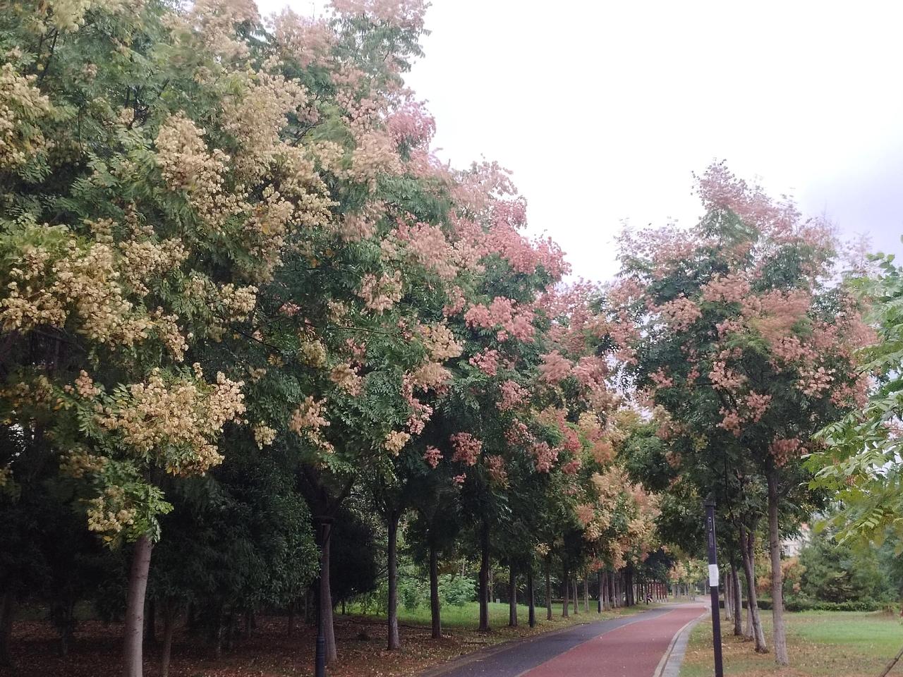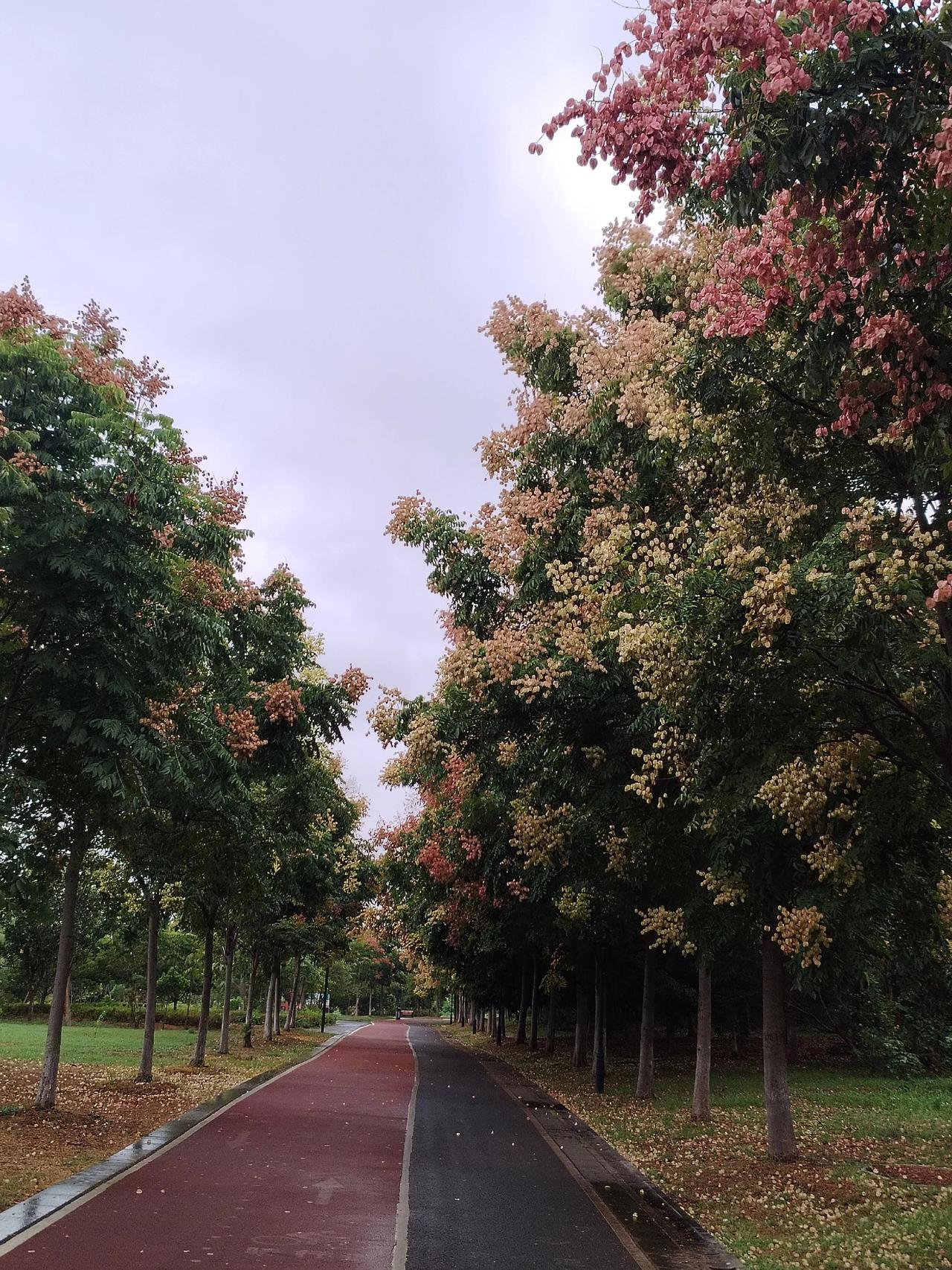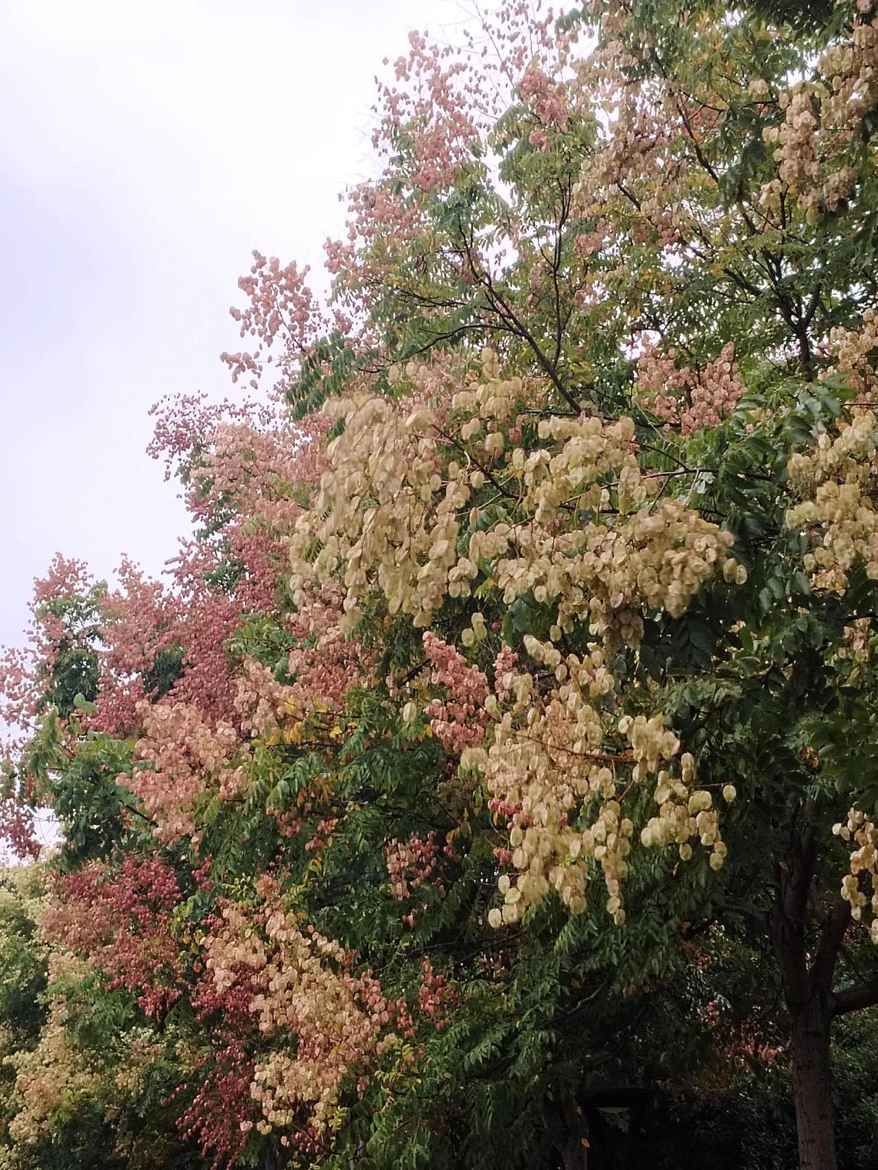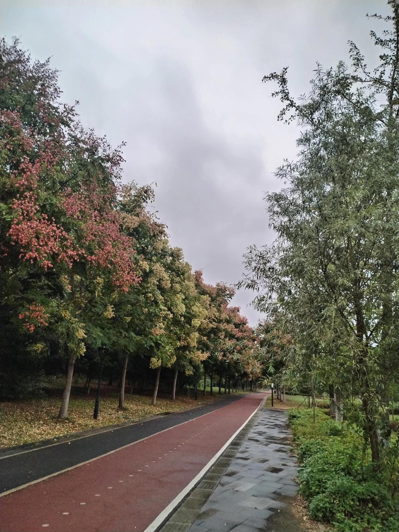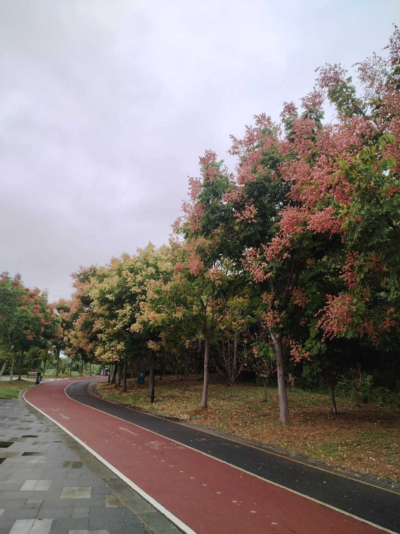 深秋的南昌,天高云淡,阳光褪去了盛夏的炽烈,变得温煦而明亮。信步于城东的一处公园绿道,却恍若踏入了一幅浓墨重彩的油画之中。 道路两旁,成排的栾树正迎来它们最绚烂的季节。这些自然的舞者,枝头仿佛打翻了调色盘: 黄的如金,红的似火,间或点缀着尚未褪尽的绿意。 那黄色的小花簇拥成穗,在微风里轻轻摇曳; 红褐色的蒴果则像一盏盏小灯笼,缀满枝头,与绿叶交织出缤纷的韵律。 南昌网红打卡地 南昌网红 南昌 秋天