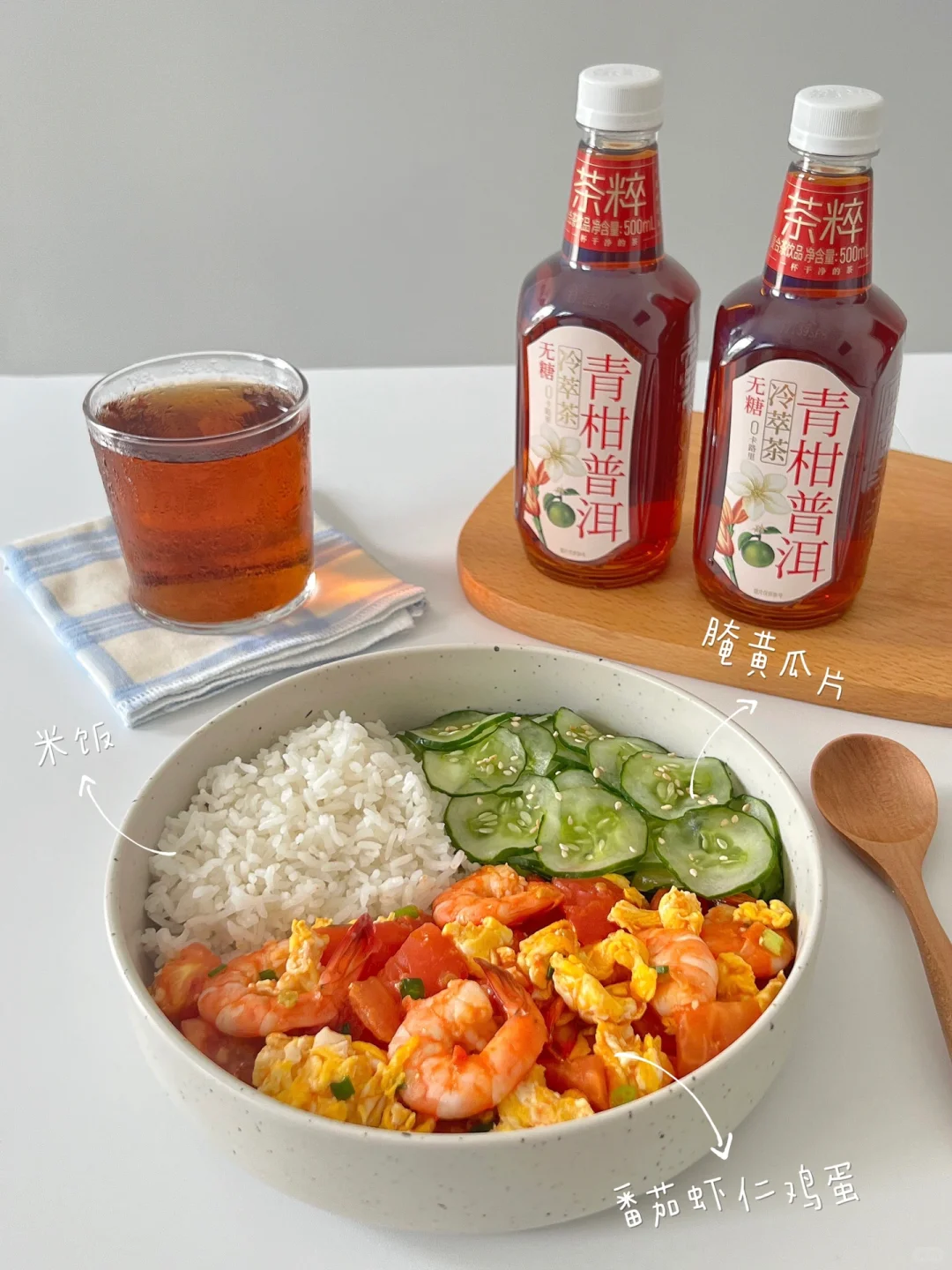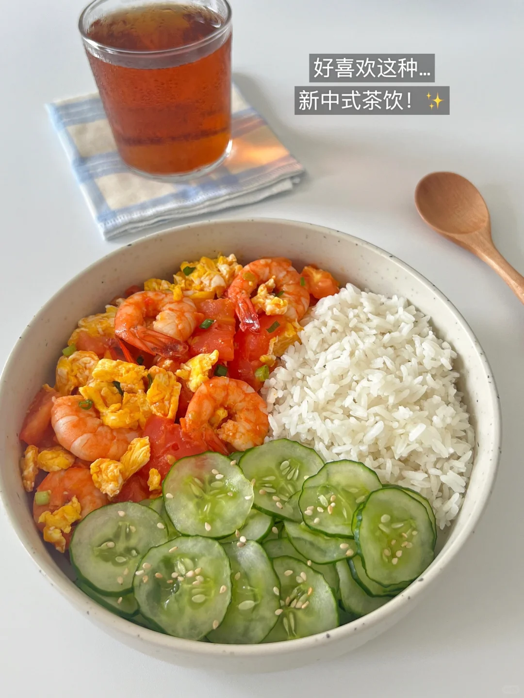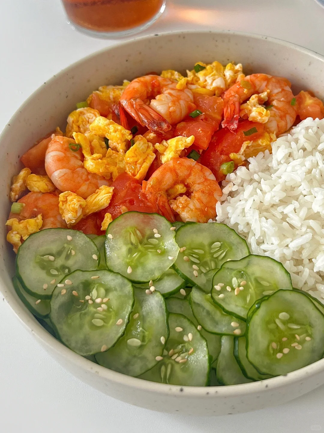 今天吃的是番茄虾仁鸡蛋➕腌黄瓜片