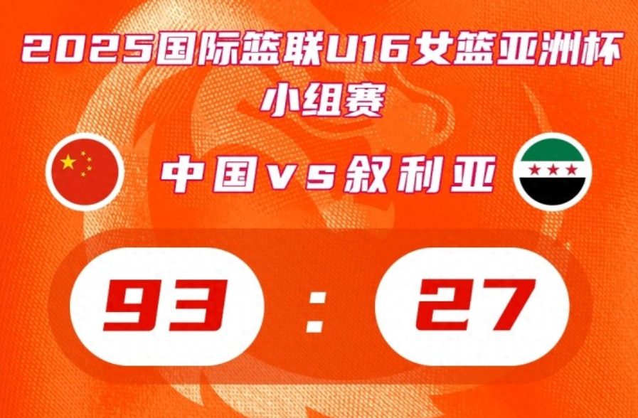 U16女篮亚洲杯小组赛,中国女篮U16对阵叙利亚女篮U16。 比赛开始,中国队外线多点开花打出不错开局,李沅珊仅打2分钟便被换下休息,最后2分多钟中国队轰出10-2小高潮建立双位数领先,次节叙利亚全面崩盘单节仅5分,朱思雨里突外投半场上双,中国队全民皆兵半场领先到23分。下半场,叙利亚更是单节一分未得,李安妮也得分上双,中国队稳扎稳打单节轰16-0直接领先到近40分,末节叙利亚又接连失误,中国队再轰20-0超级攻击波领先到近60分,最终中国队93-27狂胜叙利亚66分,半决赛资格赛将对阵菲律宾。 双方数据 中国女篮U16:刘瑞15分6板4助5断、李安妮13分8板2助3断、朱思雨12分4板1助、李玉乾10分9板、孟家艺9分1板1助2断、汤雅童8分5板、卓诗怡7分4板1助2断、黄怡霏7分3板4助2断、孙璇5分5板4助2断、李沅珊3分、袁艺芯2分3板2助4断、孙晗昀2分1助 叙利亚女篮U16:丽娜7分4板、拉亚6分2板1助、阿尔哈桑3分2板2助、范萨3分1板、沙塔2分6板2断、泽纳2分2板1助、阿尔哈姆维2分2板、弗利汉2分1板、马苏德1板、哈瓦斯利1助