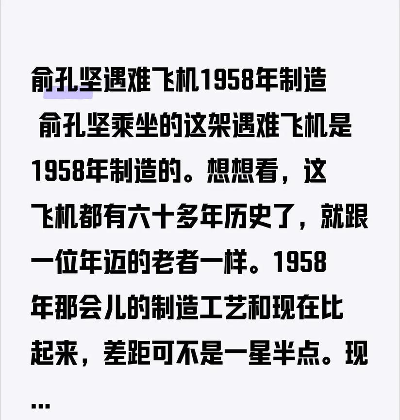 俞孔坚遇难飞机1958年制造 俞孔坚所乘遇难飞机于1958年制造。这架飞机已有六十多年历史,宛如一位年迈老者。1958年的制造工艺与现在相比,差距显著。现代飞机在安全性能、材料质量等方面有了巨大提升。这架“高龄”飞机仍在服役,不知经历多少风雨。或许它曾有辉煌飞行记录,但岁月无情,最终悲剧发生,令人唏嘘,也让我们更重视航空安全与飞机更新换代。 #遇难的飞机# #客机遇难#