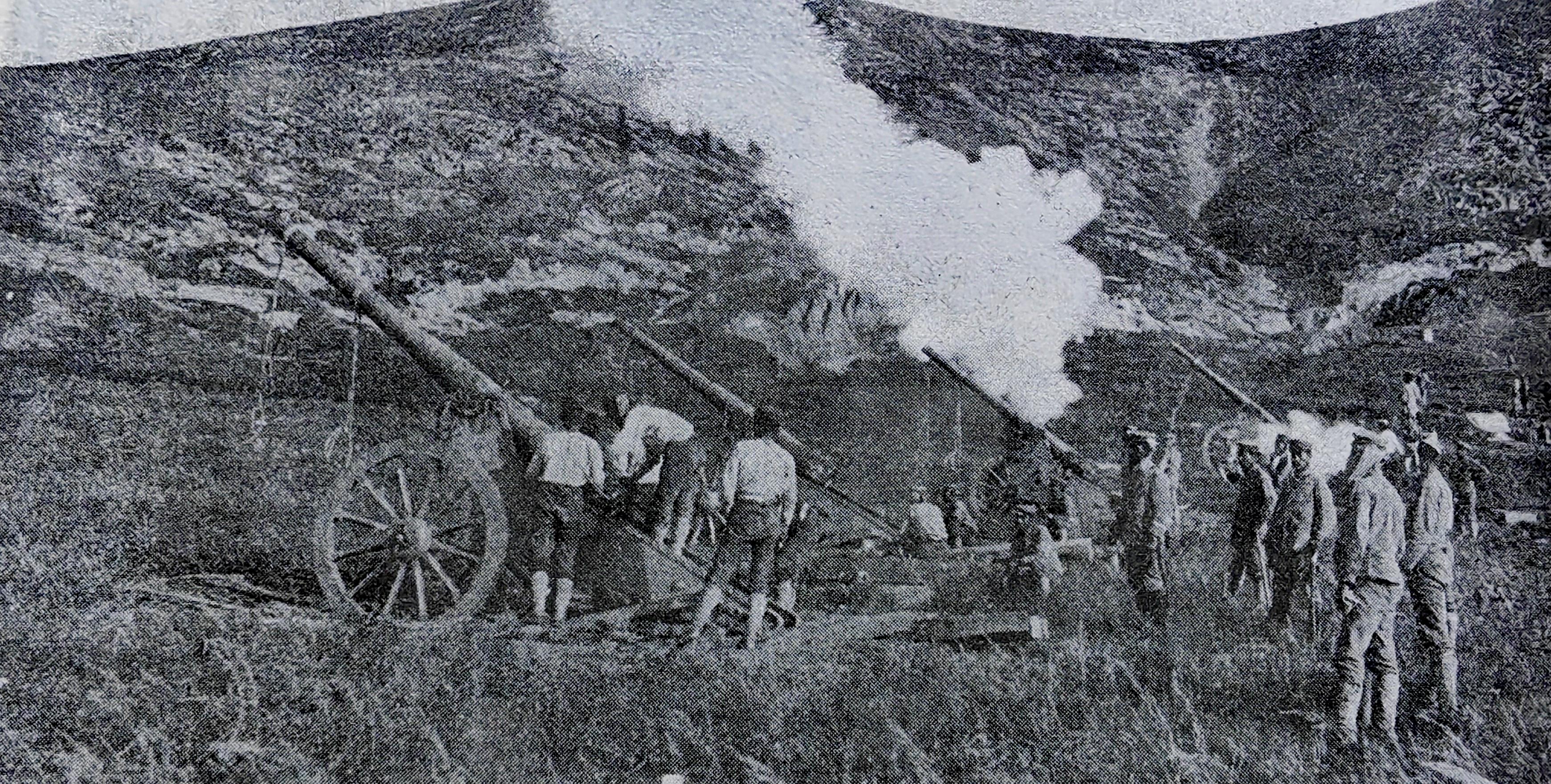 这是1904年日俄战争的辽阳战役期间,日军用缴获的重炮猛轰沙俄阵地时所拍摄的战地