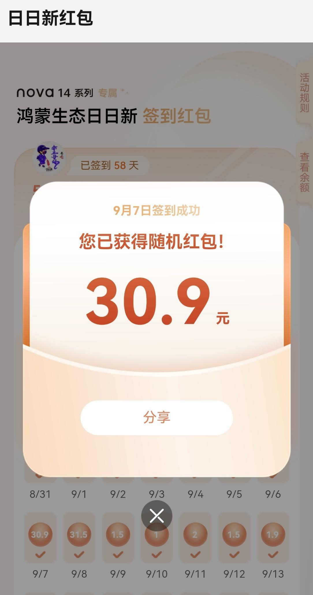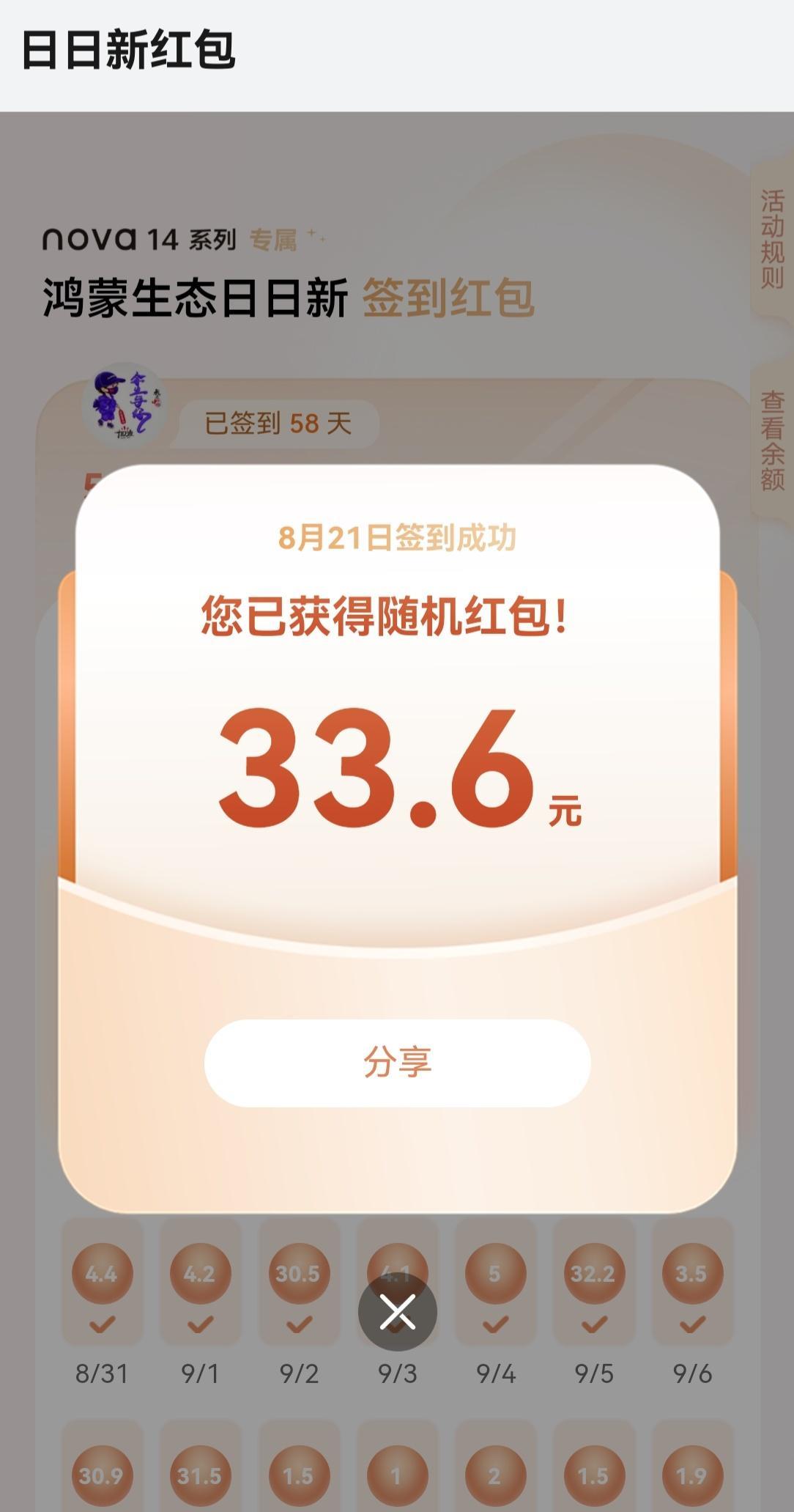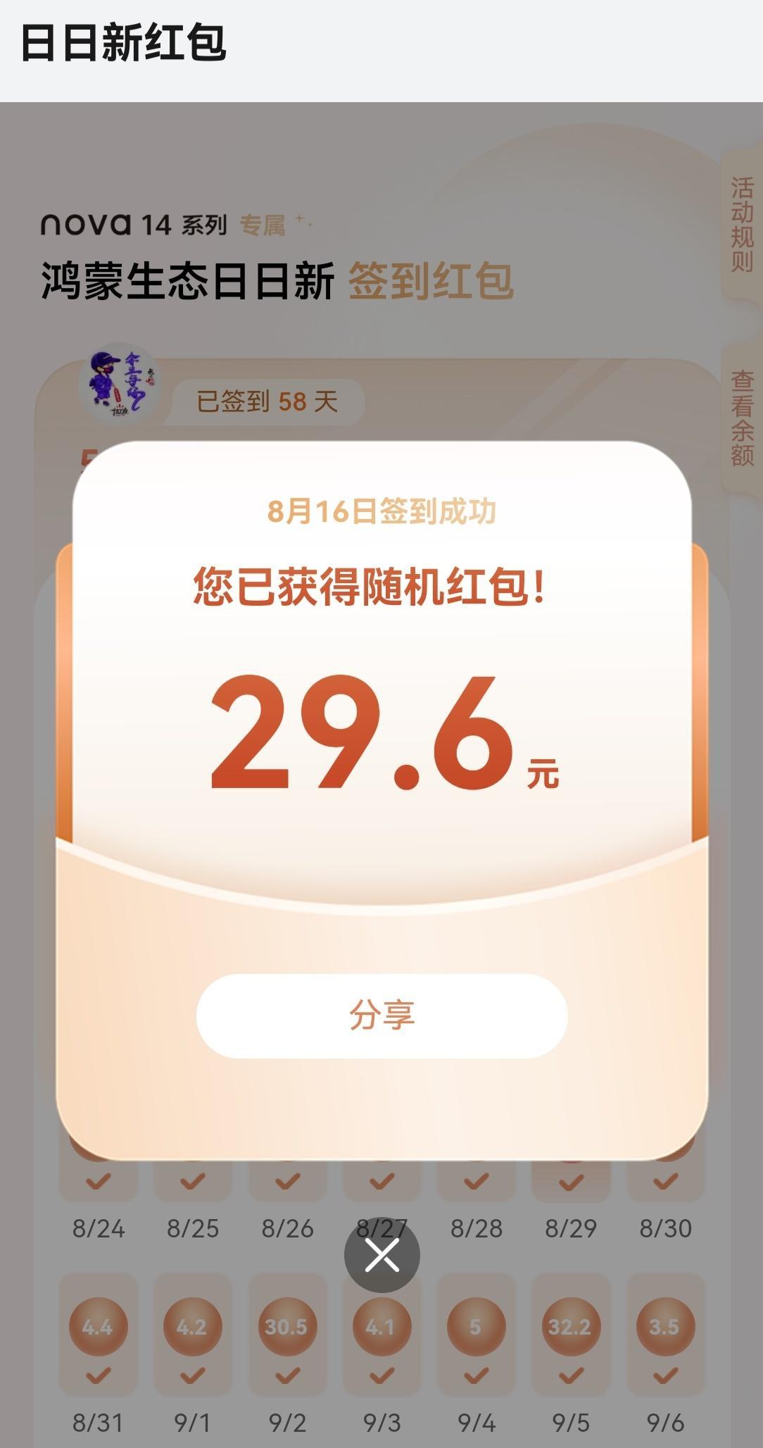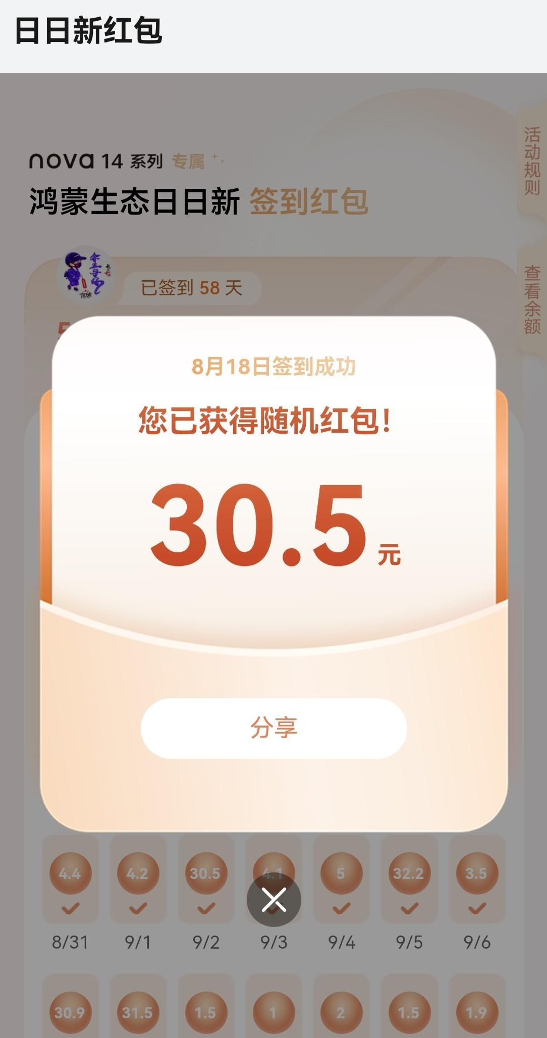 华为nova 14签到红包结束了,两个月的期限,有两天忘记签到了,总计508.49元,距离千元毕业差了好多! 最大的红包当属8月29号七夕红包99.99元,其他的大红包大部分都在30元左右,距离我自己的预期已经超出很多了! 总共有9天的红包是两位数,其他的也都是个位数,还好还好,500块也不少了!